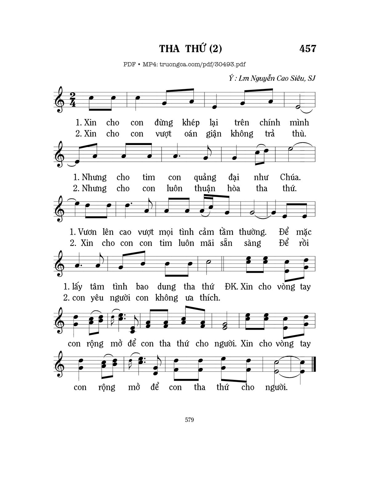 Sheet nhạc có nốt Tha thứ 2 của nhạc sĩ Mi Trầm và file PDF nốt nhạc đăng lên đây nhằm giúp các bạn xướng âm cho đúng nốt và hát thêm hay, chỉ mang tính chất tham khảo, không có mục đích thương mại. Bản quyền thuộc về tác giả và tổ chức nắm bản quyền, Truongca.com không giữ bất kỳ bản quyền của nội dung nào cả. Các bạn có thể tải về bản PDF chất lượng cao, gồm khuông nhạc có nốt với đường link file PDF bên trên.