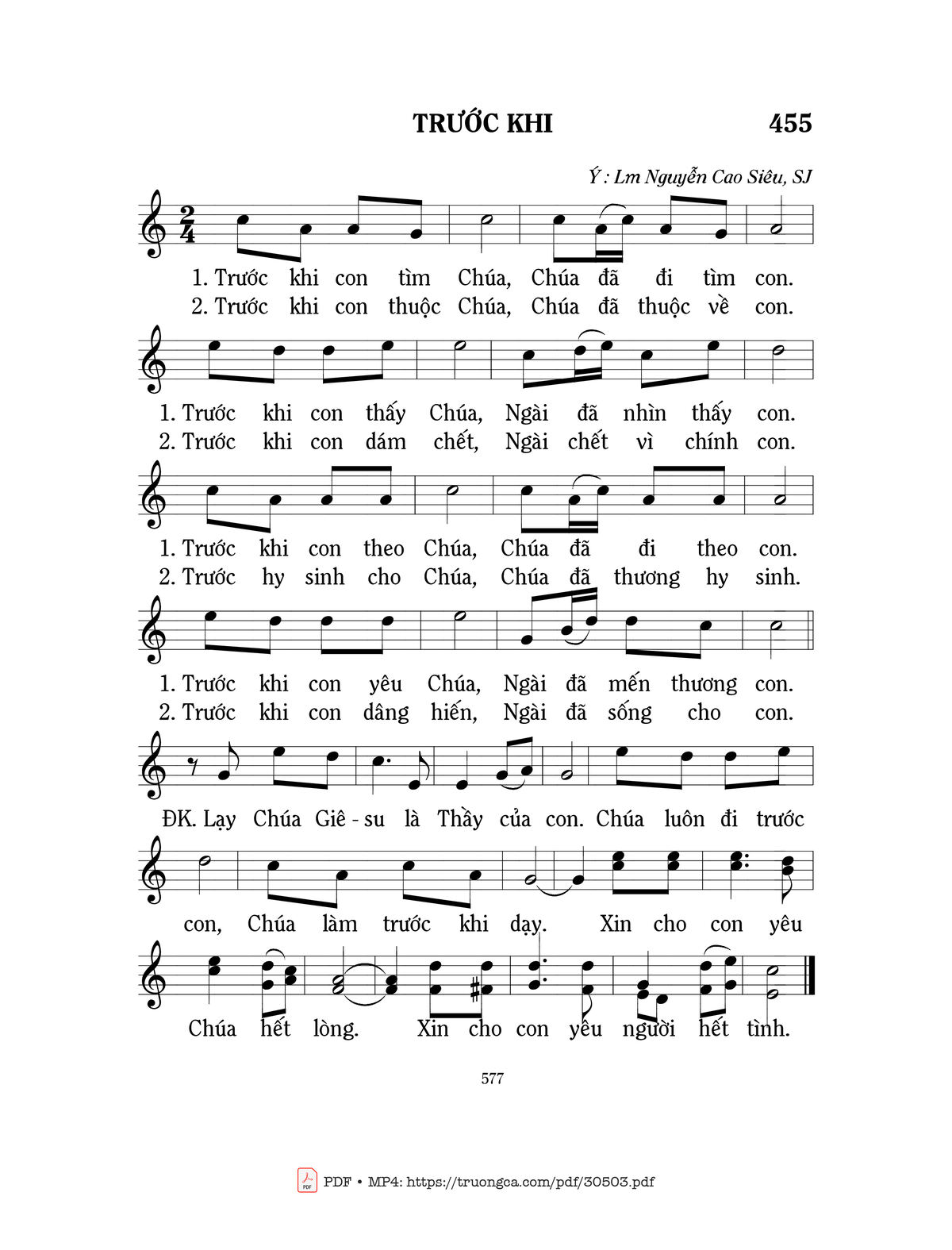 Sheet nhạc có nốt Trước khi của nhạc sĩ Mi Trầm và file PDF nốt nhạc đăng lên đây nhằm giúp các bạn xướng âm cho đúng nốt và hát thêm hay, chỉ mang tính chất tham khảo, không có mục đích thương mại. Bản quyền thuộc về tác giả và tổ chức nắm bản quyền, Truongca.com không giữ bất kỳ bản quyền của nội dung nào cả. Các bạn có thể tải về bản PDF chất lượng cao, gồm khuông nhạc có nốt với đường link file PDF bên trên.