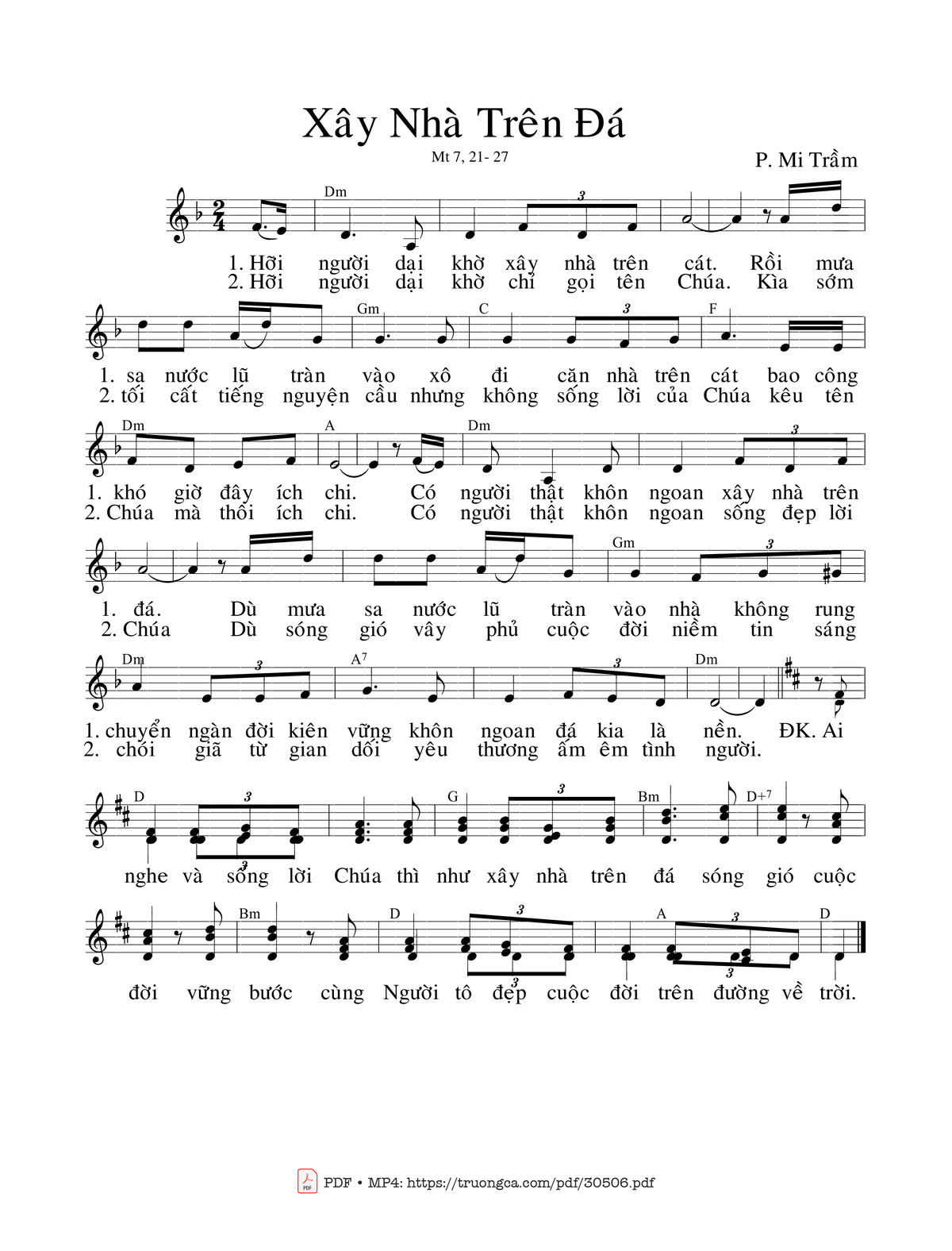 Sheet nhạc có nốt Xây Nhà Trên Đá của nhạc sĩ Mi Trầm và file PDF nốt nhạc đăng lên đây nhằm giúp các bạn xướng âm cho đúng nốt và hát thêm hay, chỉ mang tính chất tham khảo, không có mục đích thương mại. Bản quyền thuộc về tác giả và tổ chức nắm bản quyền, Truongca.com không giữ bất kỳ bản quyền của nội dung nào cả. Các bạn có thể tải về bản PDF chất lượng cao, gồm khuông nhạc có nốt với đường link file PDF bên trên.