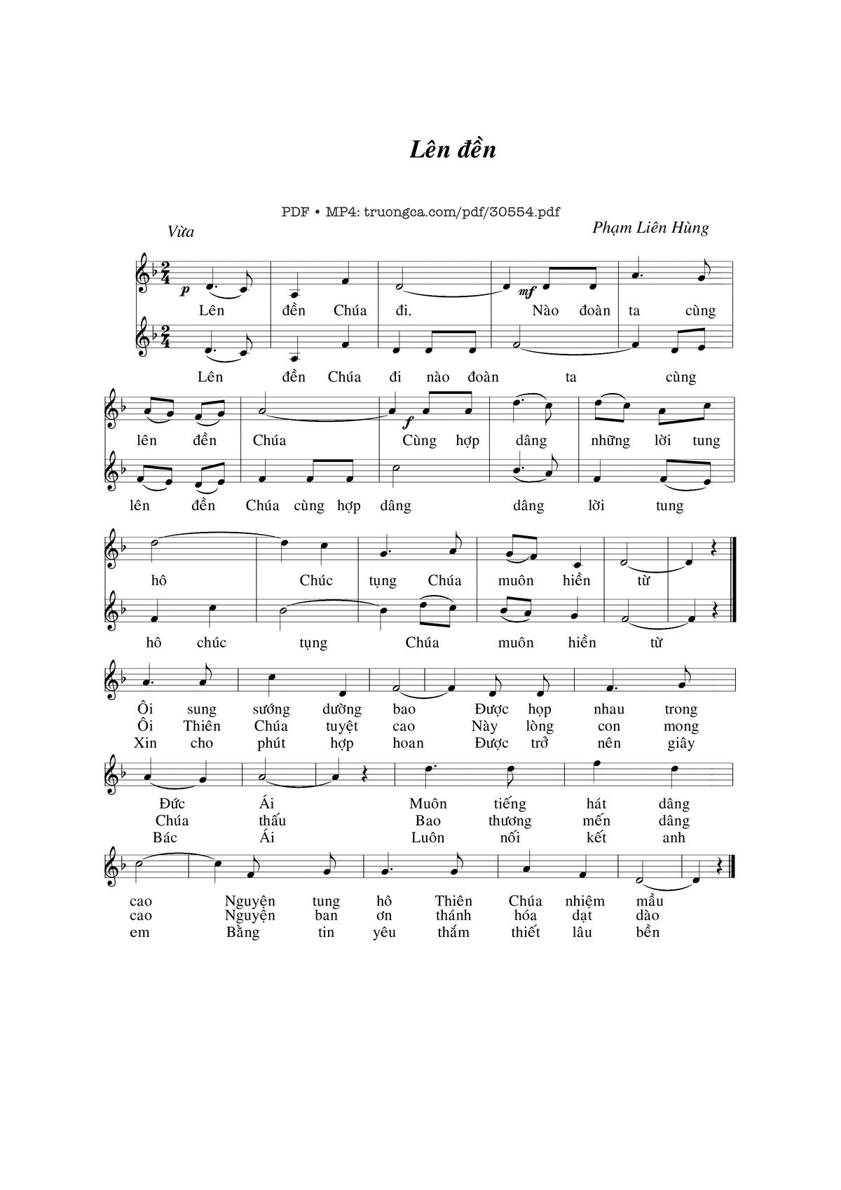 Sheet nhạc có nốt Lên đền của nhạc sĩ Phạm Liên Hùng và file PDF nốt nhạc đăng lên đây nhằm giúp các bạn xướng âm cho đúng nốt và hát thêm hay, chỉ mang tính chất tham khảo, không có mục đích thương mại. Bản quyền thuộc về tác giả và tổ chức nắm bản quyền, Truongca.com không giữ bất kỳ bản quyền của nội dung nào cả. Các bạn có thể tải về bản PDF chất lượng cao, gồm khuông nhạc có nốt với đường link file PDF bên trên.
