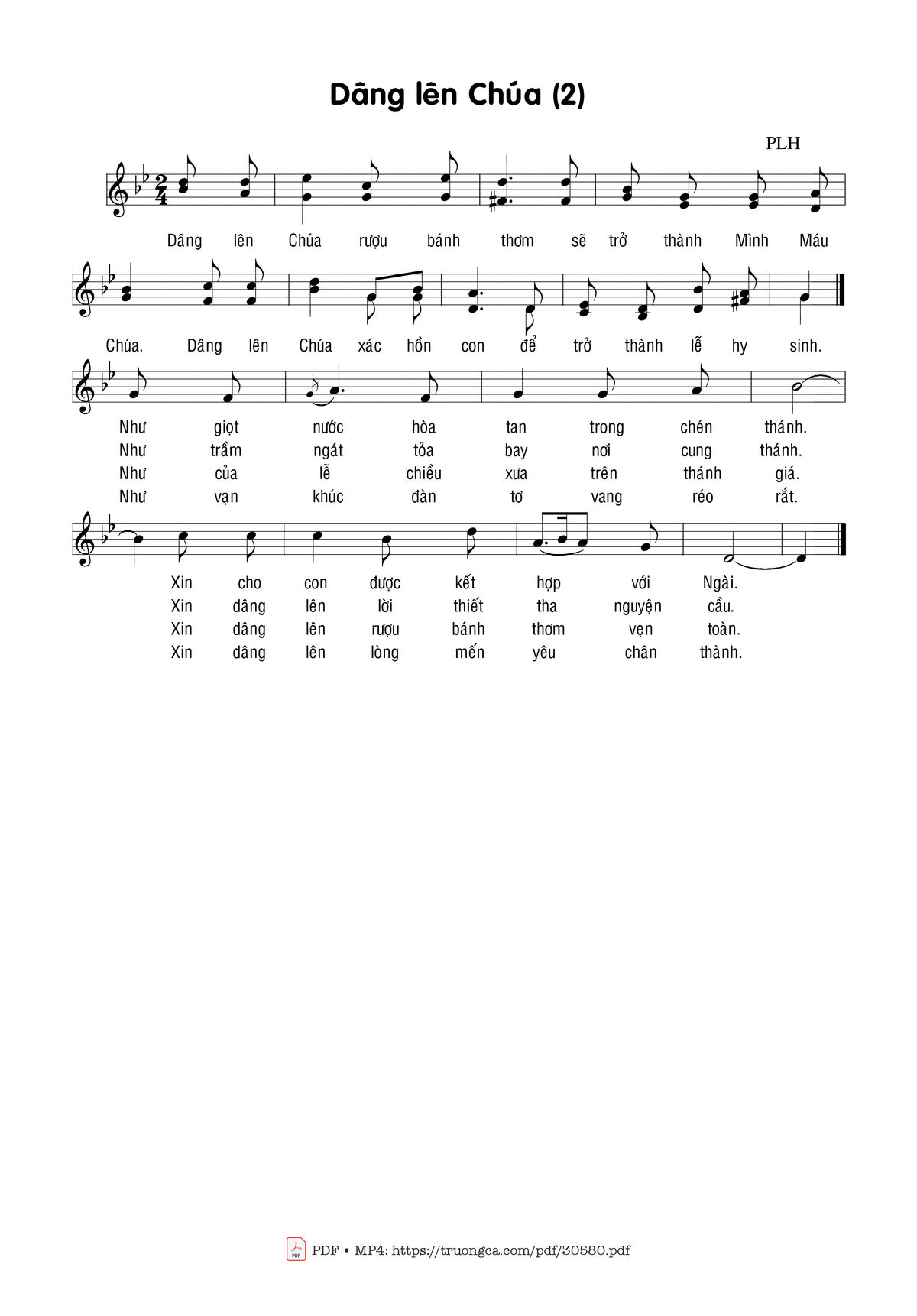 Sheet nhạc có nốt Dâng lên Chúa 2 của nhạc sĩ Phạm Liên Hùng và file PDF nốt nhạc đăng lên đây nhằm giúp các bạn xướng âm cho đúng nốt và hát thêm hay, chỉ mang tính chất tham khảo, không có mục đích thương mại. Bản quyền thuộc về tác giả và tổ chức nắm bản quyền, Truongca.com không giữ bất kỳ bản quyền của nội dung nào cả. Các bạn có thể tải về bản PDF chất lượng cao, gồm khuông nhạc có nốt với đường link file PDF bên trên.