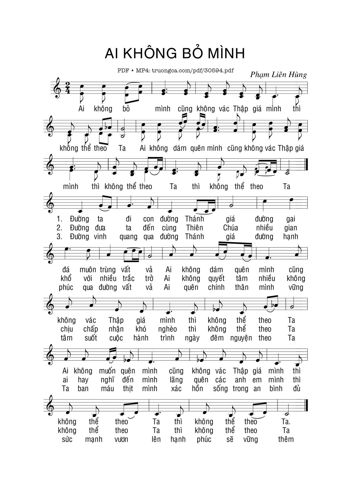 Sheet nhạc có nốt Ai không bỏ mình của nhạc sĩ Phạm Liên Hùng và file PDF nốt nhạc đăng lên đây nhằm giúp các bạn xướng âm cho đúng nốt và hát thêm hay, chỉ mang tính chất tham khảo, không có mục đích thương mại. Bản quyền thuộc về tác giả và tổ chức nắm bản quyền, Truongca.com không giữ bất kỳ bản quyền của nội dung nào cả. Các bạn có thể tải về bản PDF chất lượng cao, gồm khuông nhạc có nốt với đường link file PDF bên trên.
