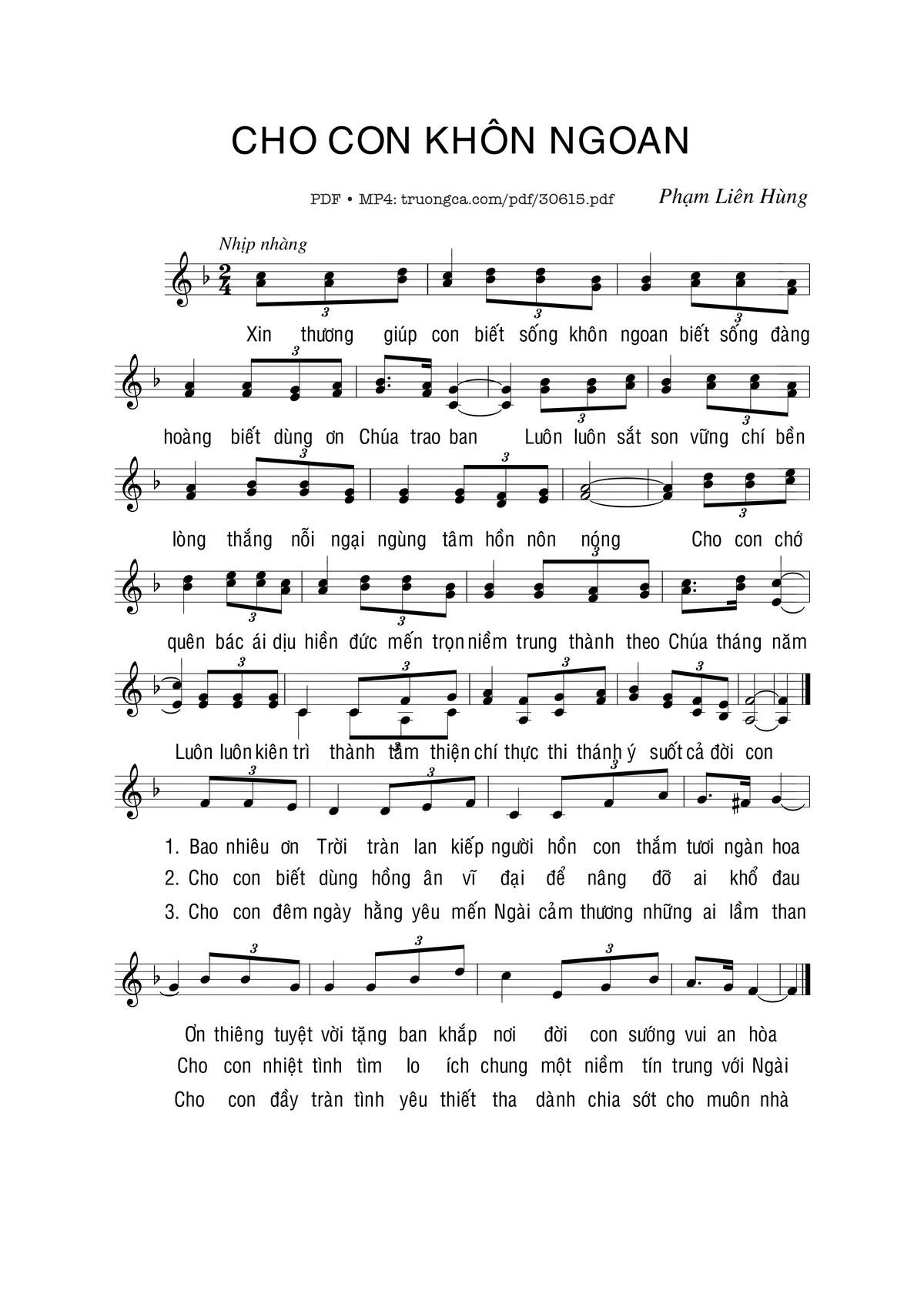 Sheet nhạc có nốt Cho con khôn ngoan của nhạc sĩ Phạm Liên Hùng và file PDF nốt nhạc đăng lên đây nhằm giúp các bạn xướng âm cho đúng nốt và hát thêm hay, chỉ mang tính chất tham khảo, không có mục đích thương mại. Bản quyền thuộc về tác giả và tổ chức nắm bản quyền, Truongca.com không giữ bất kỳ bản quyền của nội dung nào cả. Các bạn có thể tải về bản PDF chất lượng cao, gồm khuông nhạc có nốt với đường link file PDF bên trên.
