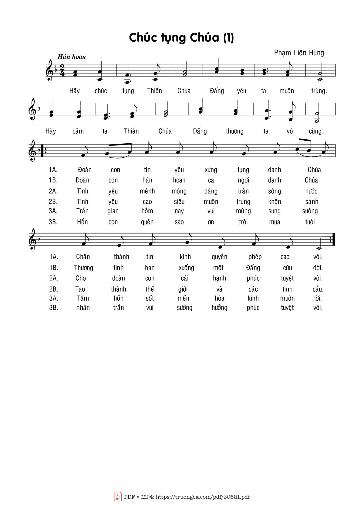 Sheet nhạc có nốt Chúc tụng Chúa (1) của nhạc sĩ Phạm Liên Hùng và file PDF nốt nhạc đăng lên đây nhằm giúp các bạn xướng âm cho đúng nốt và hát thêm hay, chỉ mang tính chất tham khảo, không có mục đích thương mại. Bản quyền thuộc về tác giả và tổ chức nắm bản quyền, Truongca.com không giữ bất kỳ bản quyền của nội dung nào cả. Các bạn có thể tải về bản PDF chất lượng cao, gồm khuông nhạc có nốt với đường link file PDF bên trên.