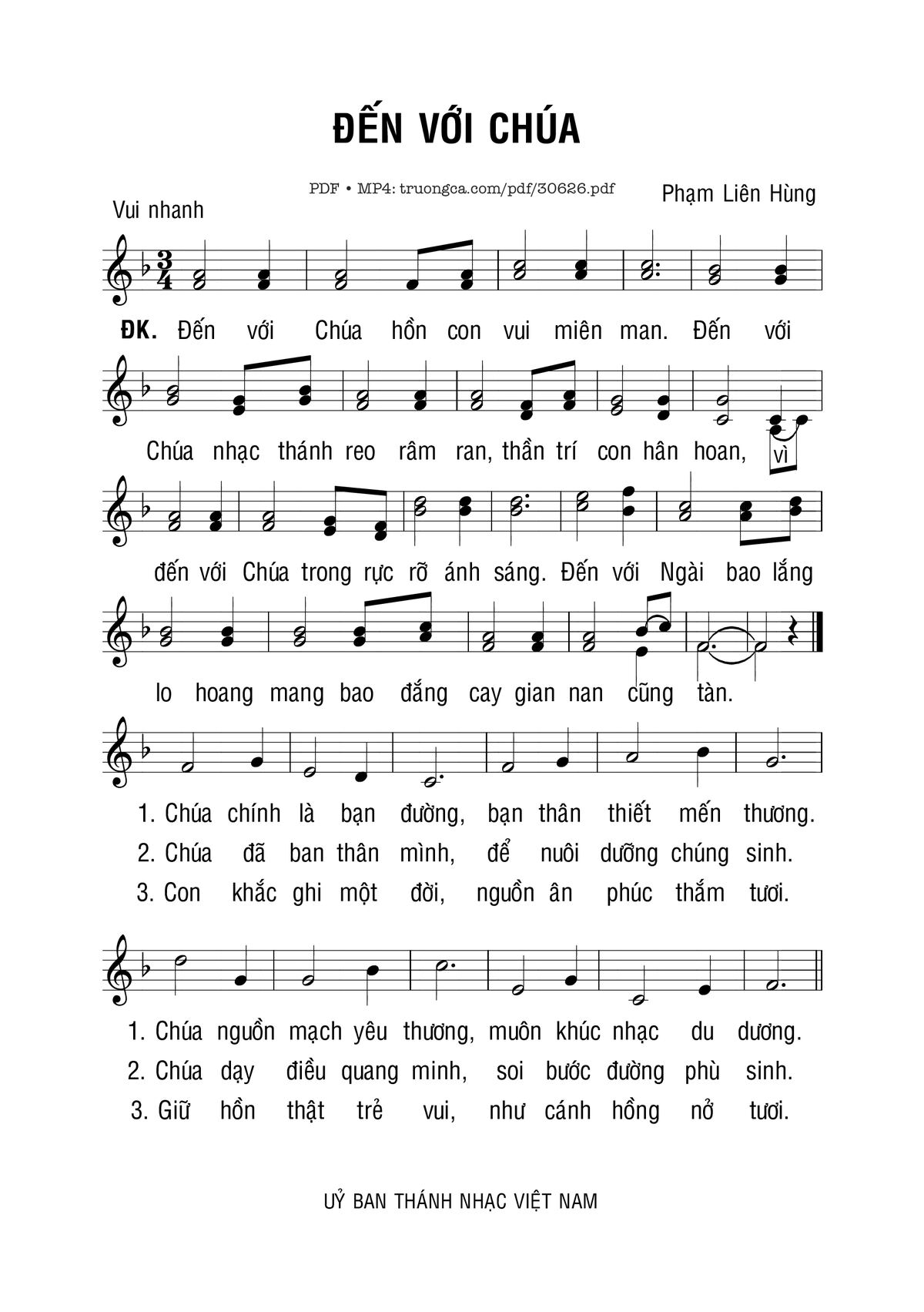 Sheet nhạc có nốt Đến với Chúa của nhạc sĩ Phạm Liên Hùng và file PDF nốt nhạc đăng lên đây nhằm giúp các bạn xướng âm cho đúng nốt và hát thêm hay, chỉ mang tính chất tham khảo, không có mục đích thương mại. Bản quyền thuộc về tác giả và tổ chức nắm bản quyền, Truongca.com không giữ bất kỳ bản quyền của nội dung nào cả. Các bạn có thể tải về bản PDF chất lượng cao, gồm khuông nhạc có nốt với đường link file PDF bên trên.
