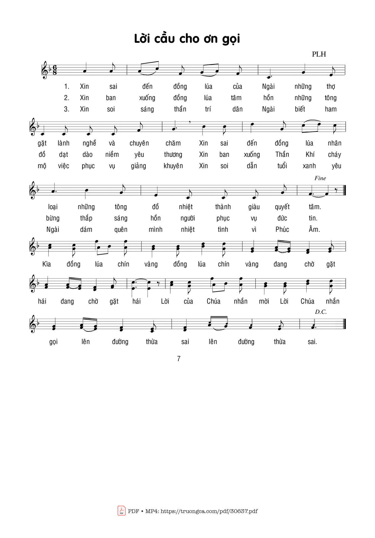 Sheet nhạc có nốt Lời Cầu Cho Ơn Gọi (1) của nhạc sĩ Phạm Liên Hùng và file PDF nốt nhạc đăng lên đây nhằm giúp các bạn xướng âm cho đúng nốt và hát thêm hay, chỉ mang tính chất tham khảo, không có mục đích thương mại. Bản quyền thuộc về tác giả và tổ chức nắm bản quyền, Truongca.com không giữ bất kỳ bản quyền của nội dung nào cả. Các bạn có thể tải về bản PDF chất lượng cao, gồm khuông nhạc có nốt với đường link file PDF bên trên.