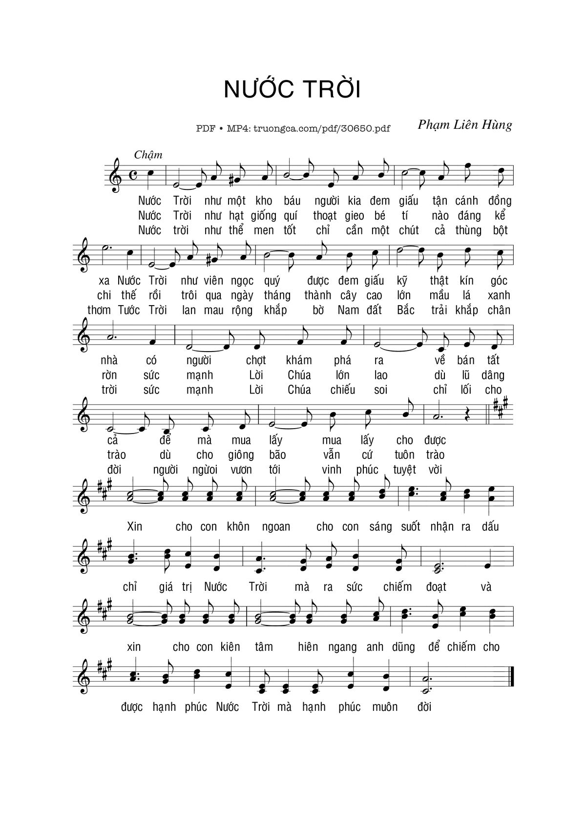 Sheet nhạc có nốt Nước Trời của nhạc sĩ Phạm Liên Hùng và file PDF nốt nhạc đăng lên đây nhằm giúp các bạn xướng âm cho đúng nốt và hát thêm hay, chỉ mang tính chất tham khảo, không có mục đích thương mại. Bản quyền thuộc về tác giả và tổ chức nắm bản quyền, Truongca.com không giữ bất kỳ bản quyền của nội dung nào cả. Các bạn có thể tải về bản PDF chất lượng cao, gồm khuông nhạc có nốt với đường link file PDF bên trên.
