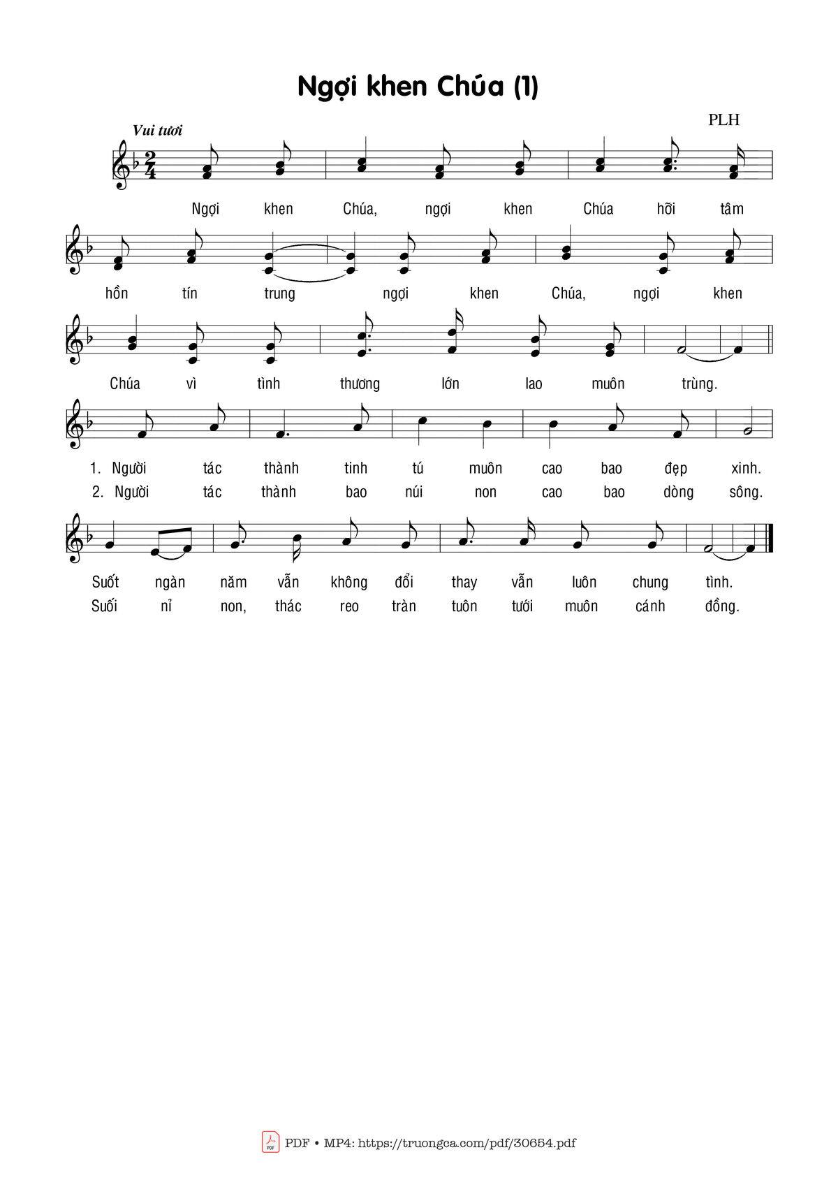 Sheet nhạc có nốt Ngợi Khen Chúa (1) của nhạc sĩ Phạm Liên Hùng và file PDF nốt nhạc đăng lên đây nhằm giúp các bạn xướng âm cho đúng nốt và hát thêm hay, chỉ mang tính chất tham khảo, không có mục đích thương mại. Bản quyền thuộc về tác giả và tổ chức nắm bản quyền, Truongca.com không giữ bất kỳ bản quyền của nội dung nào cả. Các bạn có thể tải về bản PDF chất lượng cao, gồm khuông nhạc có nốt với đường link file PDF bên trên.
