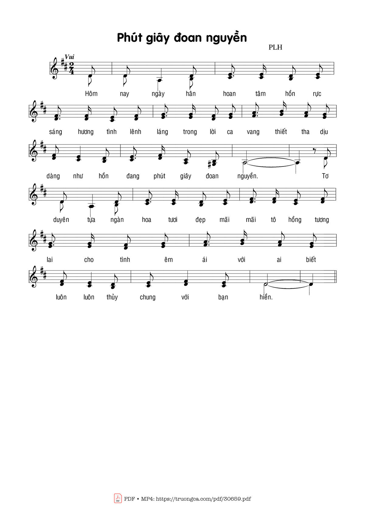 Sheet nhạc có nốt Phút giây đoan nguyền của nhạc sĩ Phạm Liên Hùng và file PDF nốt nhạc đăng lên đây nhằm giúp các bạn xướng âm cho đúng nốt và hát thêm hay, chỉ mang tính chất tham khảo, không có mục đích thương mại. Bản quyền thuộc về tác giả và tổ chức nắm bản quyền, Truongca.com không giữ bất kỳ bản quyền của nội dung nào cả. Các bạn có thể tải về bản PDF chất lượng cao, gồm khuông nhạc có nốt với đường link file PDF bên trên.