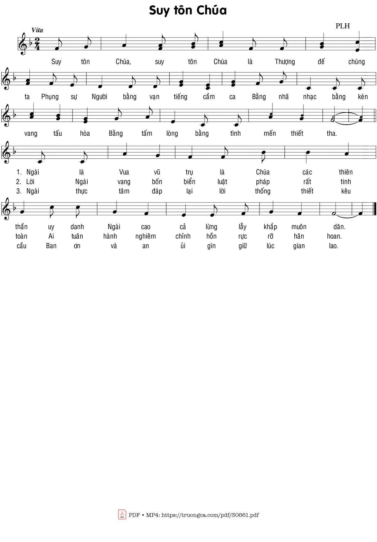 Sheet nhạc có nốt Suy tôn Chúa của nhạc sĩ Phạm Liên Hùng và file PDF nốt nhạc đăng lên đây nhằm giúp các bạn xướng âm cho đúng nốt và hát thêm hay, chỉ mang tính chất tham khảo, không có mục đích thương mại. Bản quyền thuộc về tác giả và tổ chức nắm bản quyền, Truongca.com không giữ bất kỳ bản quyền của nội dung nào cả. Các bạn có thể tải về bản PDF chất lượng cao, gồm khuông nhạc có nốt với đường link file PDF bên trên.