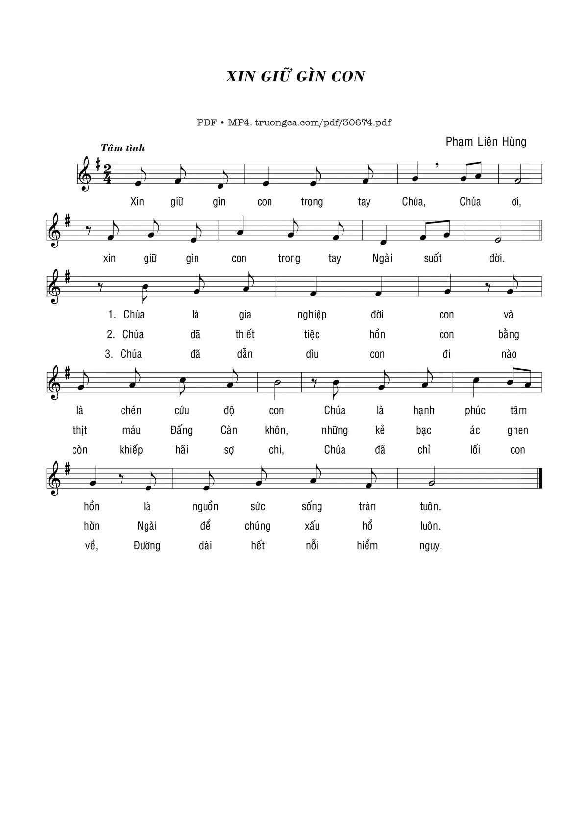 Sheet nhạc có nốt Xin giữ gìn con của nhạc sĩ Phạm Liên Hùng và file PDF nốt nhạc đăng lên đây nhằm giúp các bạn xướng âm cho đúng nốt và hát thêm hay, chỉ mang tính chất tham khảo, không có mục đích thương mại. Bản quyền thuộc về tác giả và tổ chức nắm bản quyền, Truongca.com không giữ bất kỳ bản quyền của nội dung nào cả. Các bạn có thể tải về bản PDF chất lượng cao, gồm khuông nhạc có nốt với đường link file PDF bên trên.