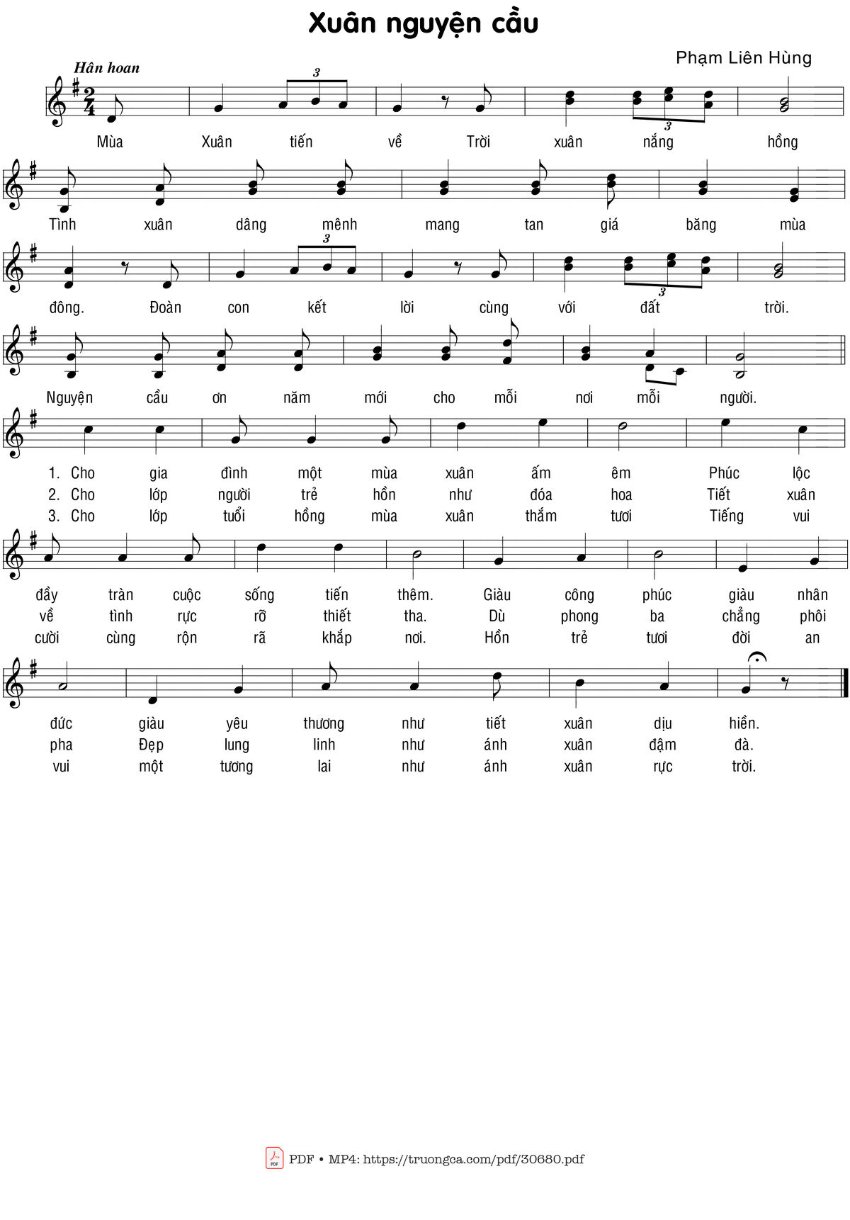 Sheet nhạc có nốt Xuân Nguyện Cầu của nhạc sĩ Phạm Liên Hùng và file PDF nốt nhạc đăng lên đây nhằm giúp các bạn xướng âm cho đúng nốt và hát thêm hay, chỉ mang tính chất tham khảo, không có mục đích thương mại. Bản quyền thuộc về tác giả và tổ chức nắm bản quyền, Truongca.com không giữ bất kỳ bản quyền của nội dung nào cả. Các bạn có thể tải về bản PDF chất lượng cao, gồm khuông nhạc có nốt với đường link file PDF bên trên.