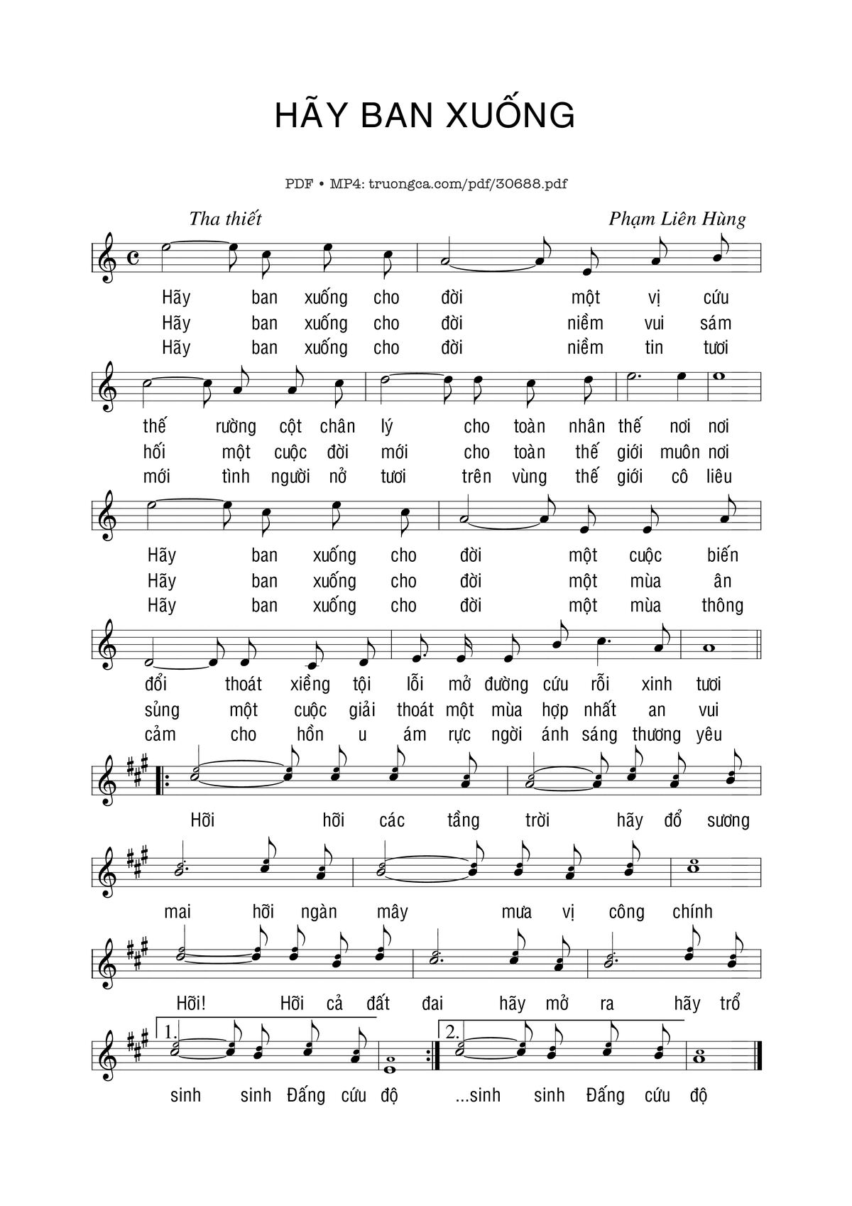 Sheet nhạc có nốt Hãy ban xuống của nhạc sĩ Phạm Liên Hùng và file PDF nốt nhạc đăng lên đây nhằm giúp các bạn xướng âm cho đúng nốt và hát thêm hay, chỉ mang tính chất tham khảo, không có mục đích thương mại. Bản quyền thuộc về tác giả và tổ chức nắm bản quyền, Truongca.com không giữ bất kỳ bản quyền của nội dung nào cả. Các bạn có thể tải về bản PDF chất lượng cao, gồm khuông nhạc có nốt với đường link file PDF bên trên.