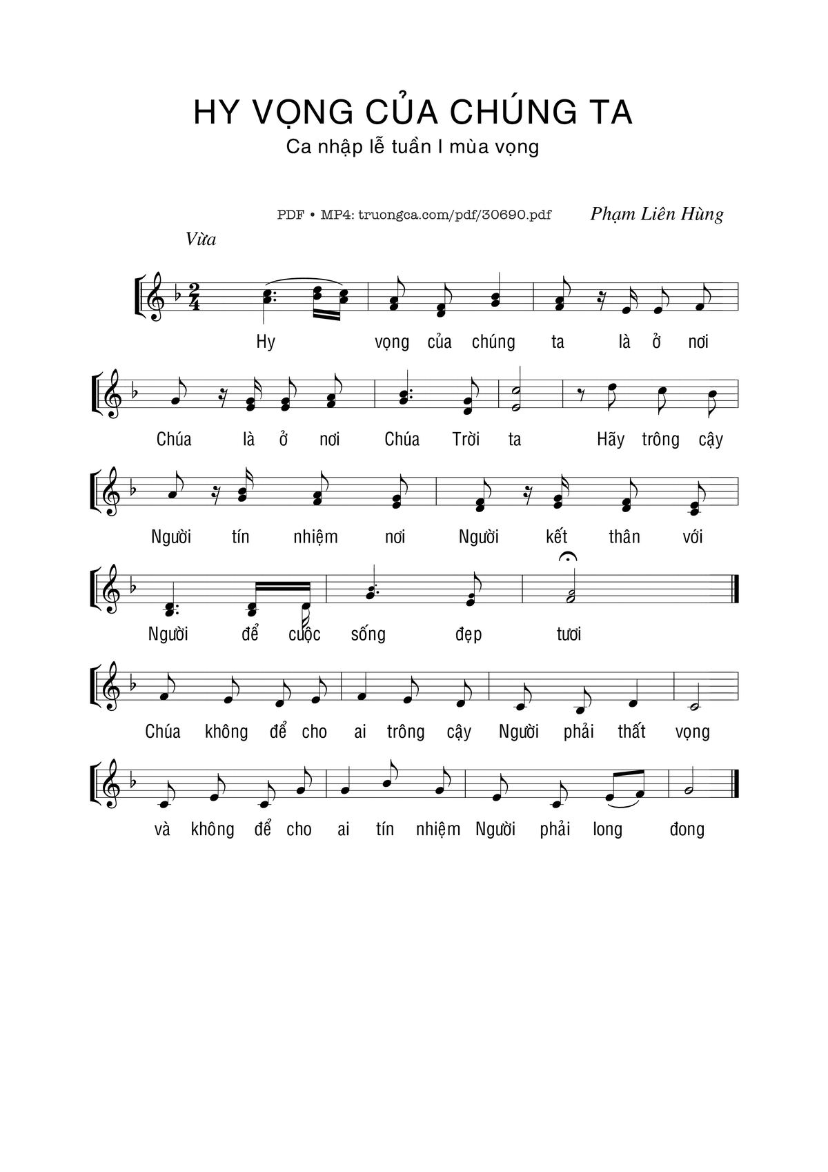 Sheet nhạc có nốt Hy vọng của chúng ta của nhạc sĩ Phạm Liên Hùng và file PDF nốt nhạc đăng lên đây nhằm giúp các bạn xướng âm cho đúng nốt và hát thêm hay, chỉ mang tính chất tham khảo, không có mục đích thương mại. Bản quyền thuộc về tác giả và tổ chức nắm bản quyền, Truongca.com không giữ bất kỳ bản quyền của nội dung nào cả. Các bạn có thể tải về bản PDF chất lượng cao, gồm khuông nhạc có nốt với đường link file PDF bên trên.
