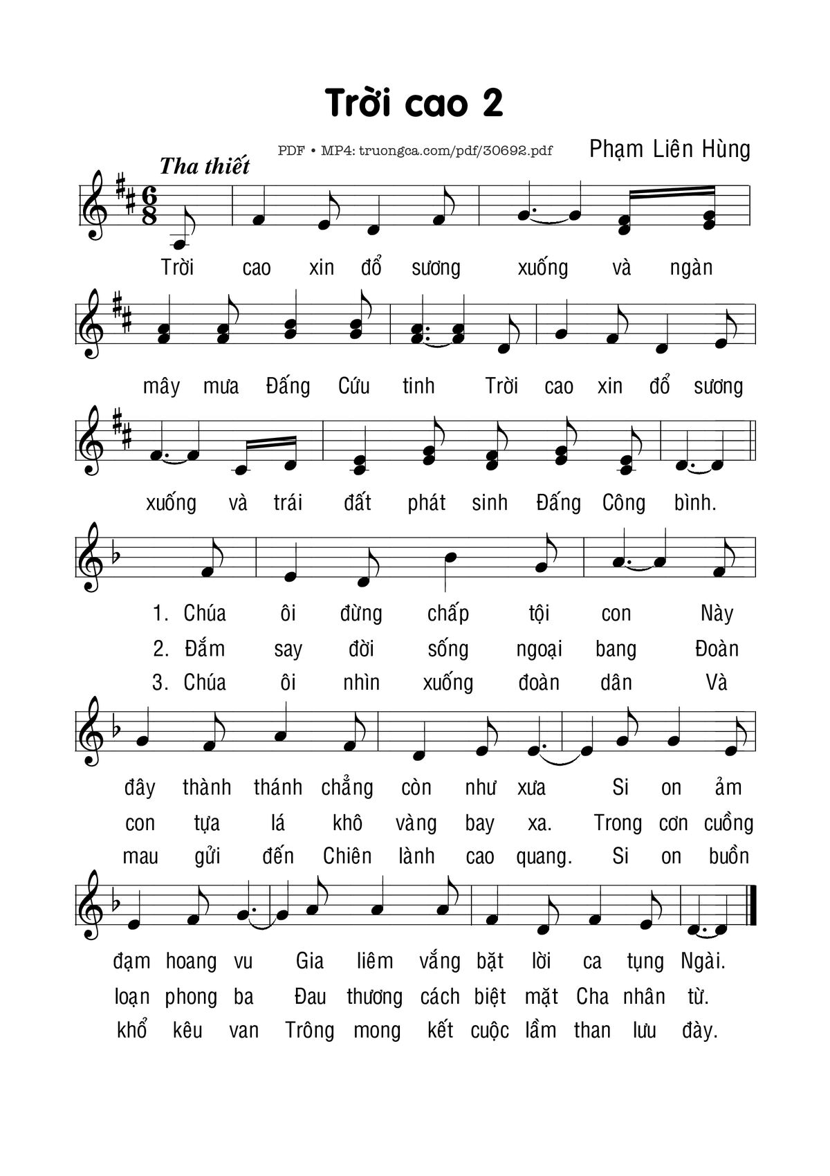 Sheet nhạc có nốt Trời cao (2) của nhạc sĩ Phạm Liên Hùng và file PDF nốt nhạc đăng lên đây nhằm giúp các bạn xướng âm cho đúng nốt và hát thêm hay, chỉ mang tính chất tham khảo, không có mục đích thương mại. Bản quyền thuộc về tác giả và tổ chức nắm bản quyền, Truongca.com không giữ bất kỳ bản quyền của nội dung nào cả. Các bạn có thể tải về bản PDF chất lượng cao, gồm khuông nhạc có nốt với đường link file PDF bên trên.