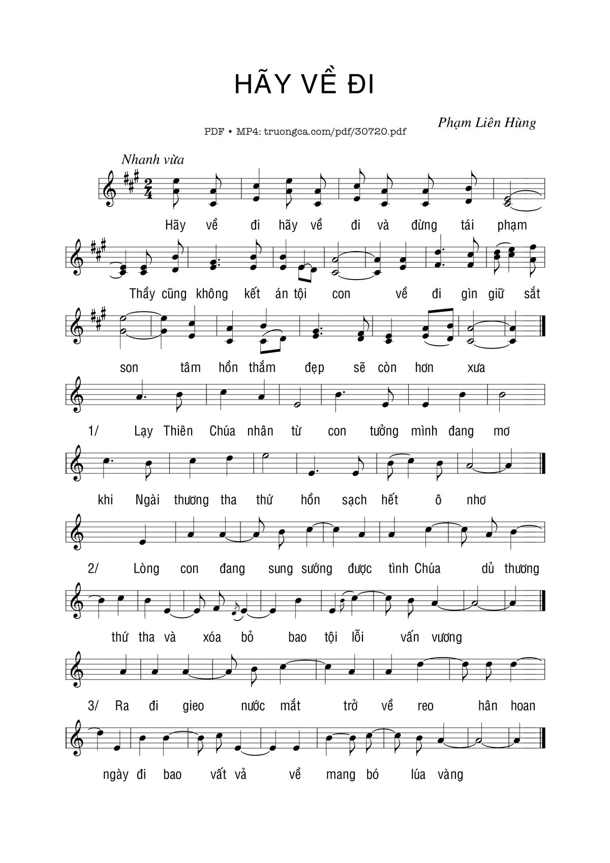 Sheet nhạc có nốt Hãy về đi của nhạc sĩ Phạm Liên Hùng và file PDF nốt nhạc đăng lên đây nhằm giúp các bạn xướng âm cho đúng nốt và hát thêm hay, chỉ mang tính chất tham khảo, không có mục đích thương mại. Bản quyền thuộc về tác giả và tổ chức nắm bản quyền, Truongca.com không giữ bất kỳ bản quyền của nội dung nào cả. Các bạn có thể tải về bản PDF chất lượng cao, gồm khuông nhạc có nốt với đường link file PDF bên trên.
