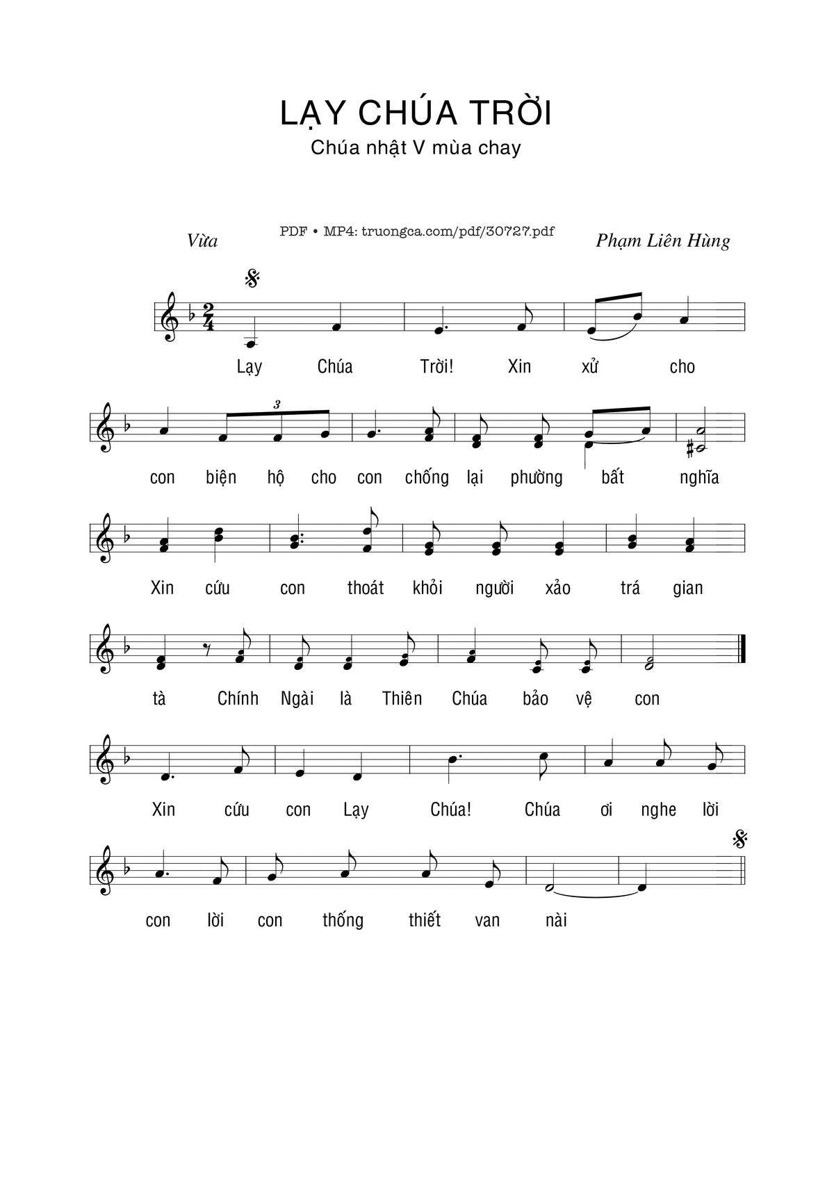 Sheet nhạc có nốt Lạy Chúa Trời của nhạc sĩ Phạm Liên Hùng và file PDF nốt nhạc đăng lên đây nhằm giúp các bạn xướng âm cho đúng nốt và hát thêm hay, chỉ mang tính chất tham khảo, không có mục đích thương mại. Bản quyền thuộc về tác giả và tổ chức nắm bản quyền, Truongca.com không giữ bất kỳ bản quyền của nội dung nào cả. Các bạn có thể tải về bản PDF chất lượng cao, gồm khuông nhạc có nốt với đường link file PDF bên trên.