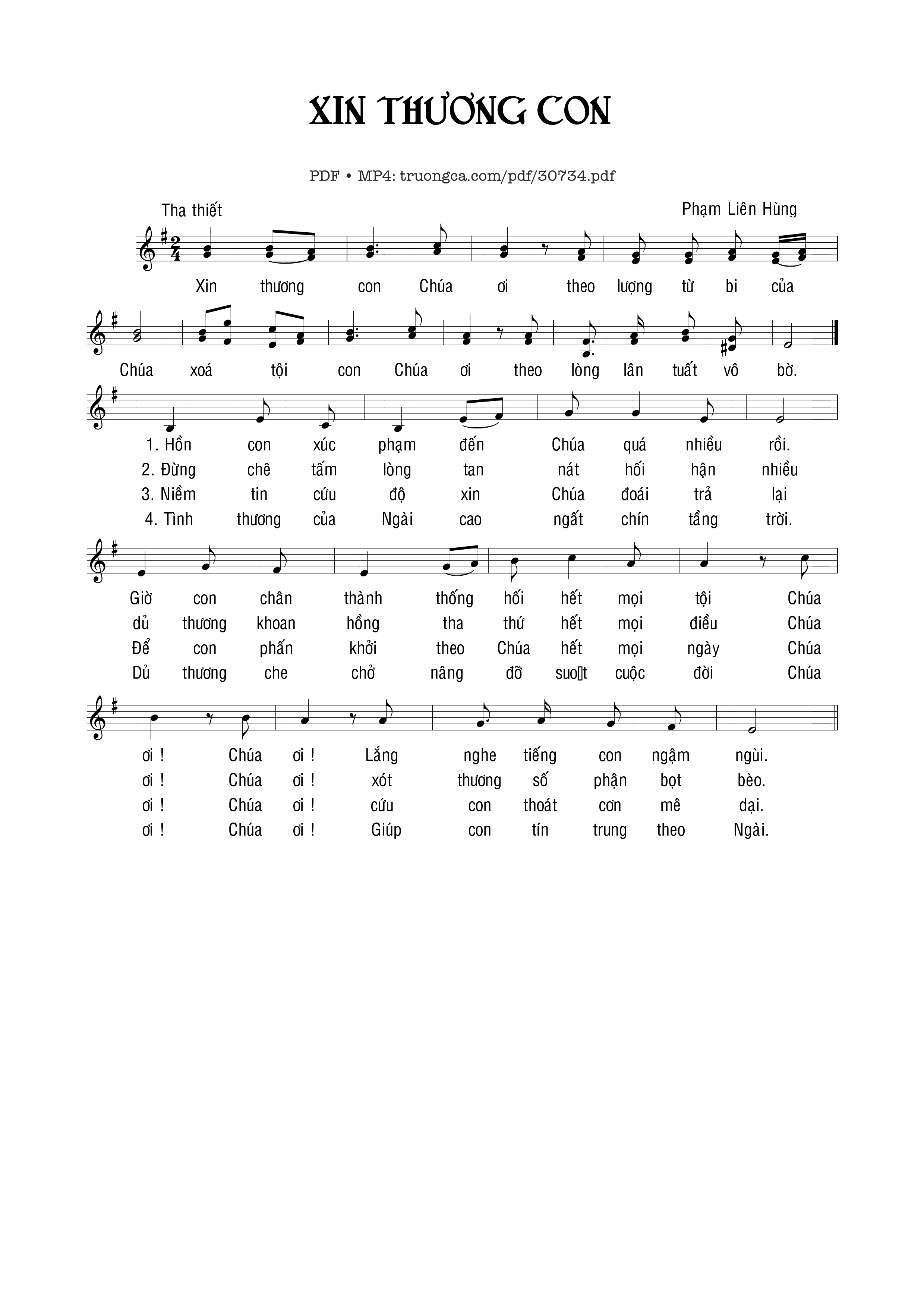 Sheet nhạc có nốt Xin thương con của nhạc sĩ Phạm Liên Hùng và file PDF nốt nhạc đăng lên đây nhằm giúp các bạn xướng âm cho đúng nốt và hát thêm hay, chỉ mang tính chất tham khảo, không có mục đích thương mại. Bản quyền thuộc về tác giả và tổ chức nắm bản quyền, Truongca.com không giữ bất kỳ bản quyền của nội dung nào cả. Các bạn có thể tải về bản PDF chất lượng cao, gồm khuông nhạc có nốt với đường link file PDF bên trên.