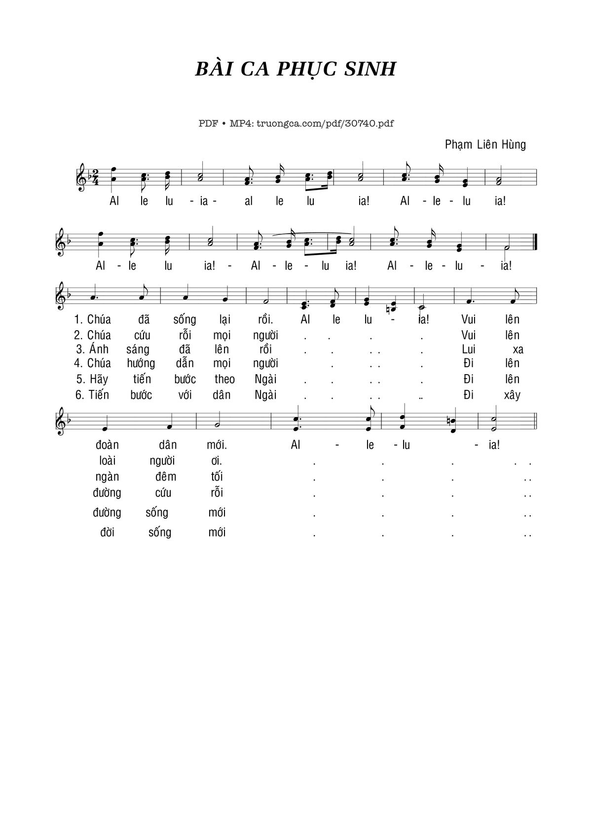 Sheet nhạc có nốt Bài ca Phục Sinh của nhạc sĩ Phạm Liên Hùng và file PDF nốt nhạc đăng lên đây nhằm giúp các bạn xướng âm cho đúng nốt và hát thêm hay, chỉ mang tính chất tham khảo, không có mục đích thương mại. Bản quyền thuộc về tác giả và tổ chức nắm bản quyền, Truongca.com không giữ bất kỳ bản quyền của nội dung nào cả. Các bạn có thể tải về bản PDF chất lượng cao, gồm khuông nhạc có nốt với đường link file PDF bên trên.