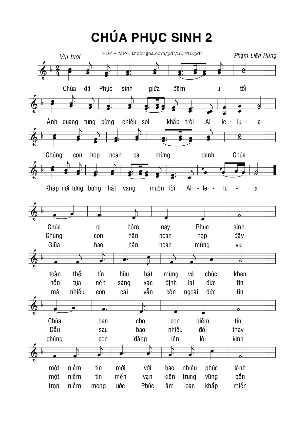 Sheet nhạc có nốt Chúa phục sinh (2) của nhạc sĩ Phạm Liên Hùng và file PDF nốt nhạc đăng lên đây nhằm giúp các bạn xướng âm cho đúng nốt và hát thêm hay, chỉ mang tính chất tham khảo, không có mục đích thương mại. Bản quyền thuộc về tác giả và tổ chức nắm bản quyền, Truongca.com không giữ bất kỳ bản quyền của nội dung nào cả. Các bạn có thể tải về bản PDF chất lượng cao, gồm khuông nhạc có nốt với đường link file PDF bên trên.
