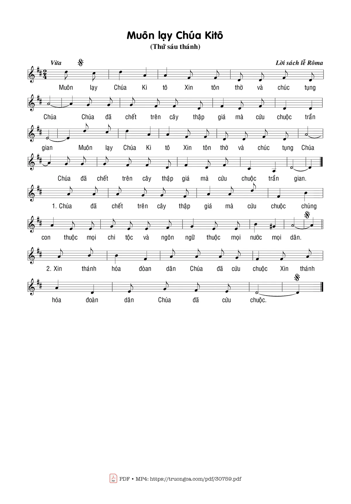 Sheet nhạc có nốt Muôn Lạy Chúa Kitô của nhạc sĩ Phạm Liên Hùng và file PDF nốt nhạc đăng lên đây nhằm giúp các bạn xướng âm cho đúng nốt và hát thêm hay, chỉ mang tính chất tham khảo, không có mục đích thương mại. Bản quyền thuộc về tác giả và tổ chức nắm bản quyền, Truongca.com không giữ bất kỳ bản quyền của nội dung nào cả. Các bạn có thể tải về bản PDF chất lượng cao, gồm khuông nhạc có nốt với đường link file PDF bên trên.