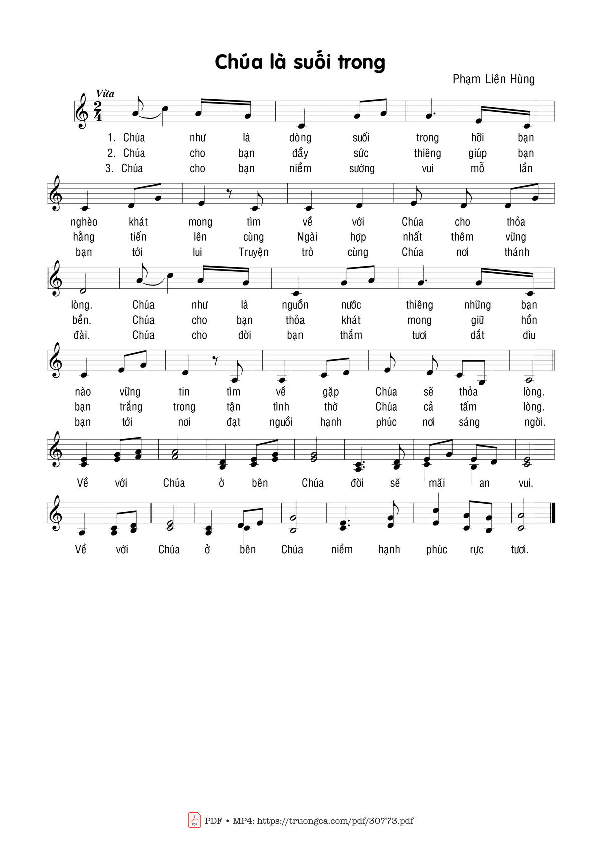 Sheet nhạc có nốt Chúa Là Suối Trong của nhạc sĩ Phạm Liên Hùng và file PDF nốt nhạc đăng lên đây nhằm giúp các bạn xướng âm cho đúng nốt và hát thêm hay, chỉ mang tính chất tham khảo, không có mục đích thương mại. Bản quyền thuộc về tác giả và tổ chức nắm bản quyền, Truongca.com không giữ bất kỳ bản quyền của nội dung nào cả. Các bạn có thể tải về bản PDF chất lượng cao, gồm khuông nhạc có nốt với đường link file PDF bên trên.