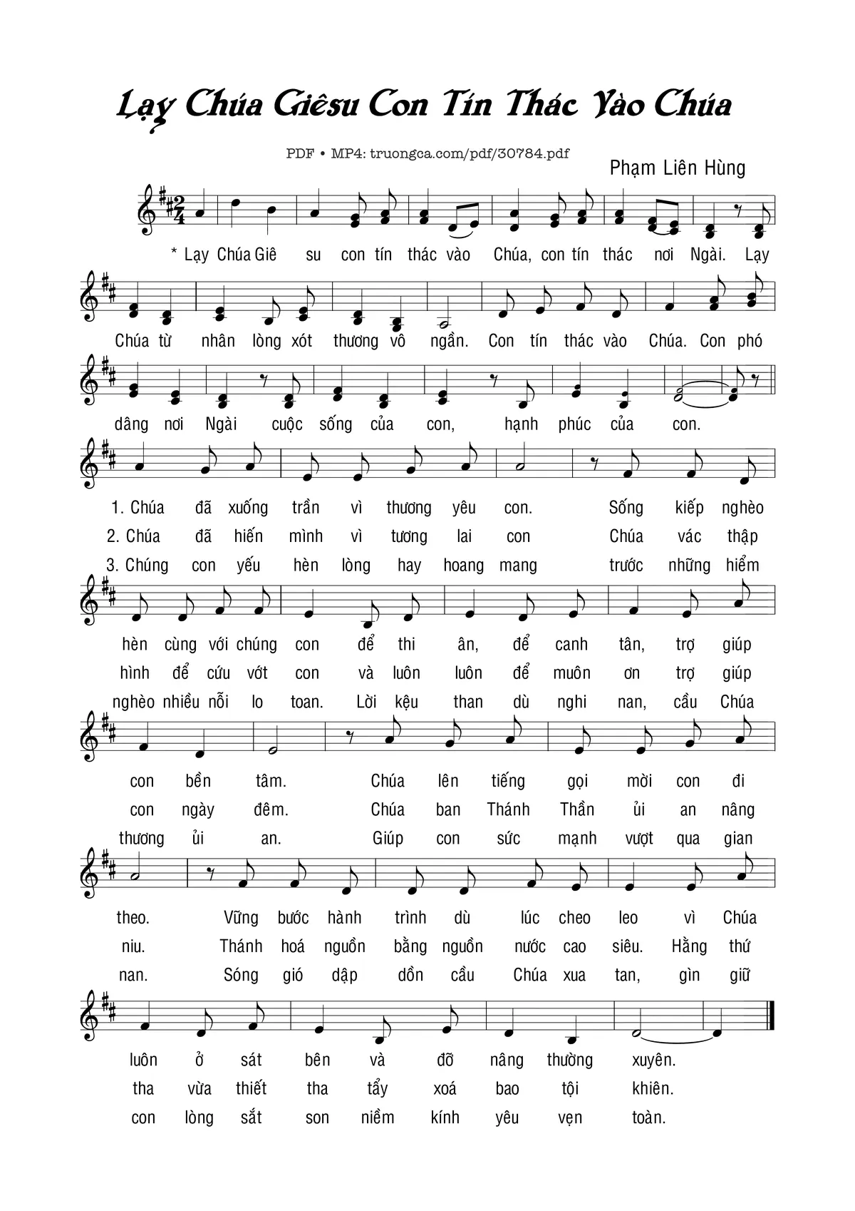 Sheet nhạc có nốt Lạy Chúa Giêsu con tín thác vào Chúa (1) của nhạc sĩ Phạm Liên Hùng và file PDF nốt nhạc đăng lên đây nhằm giúp các bạn xướng âm cho đúng nốt và hát thêm hay, chỉ mang tính chất tham khảo, không có mục đích thương mại. Bản quyền thuộc về tác giả và tổ chức nắm bản quyền, Truongca.com không giữ bất kỳ bản quyền của nội dung nào cả. Các bạn có thể tải về bản PDF chất lượng cao, gồm khuông nhạc có nốt với đường link file PDF bên trên.