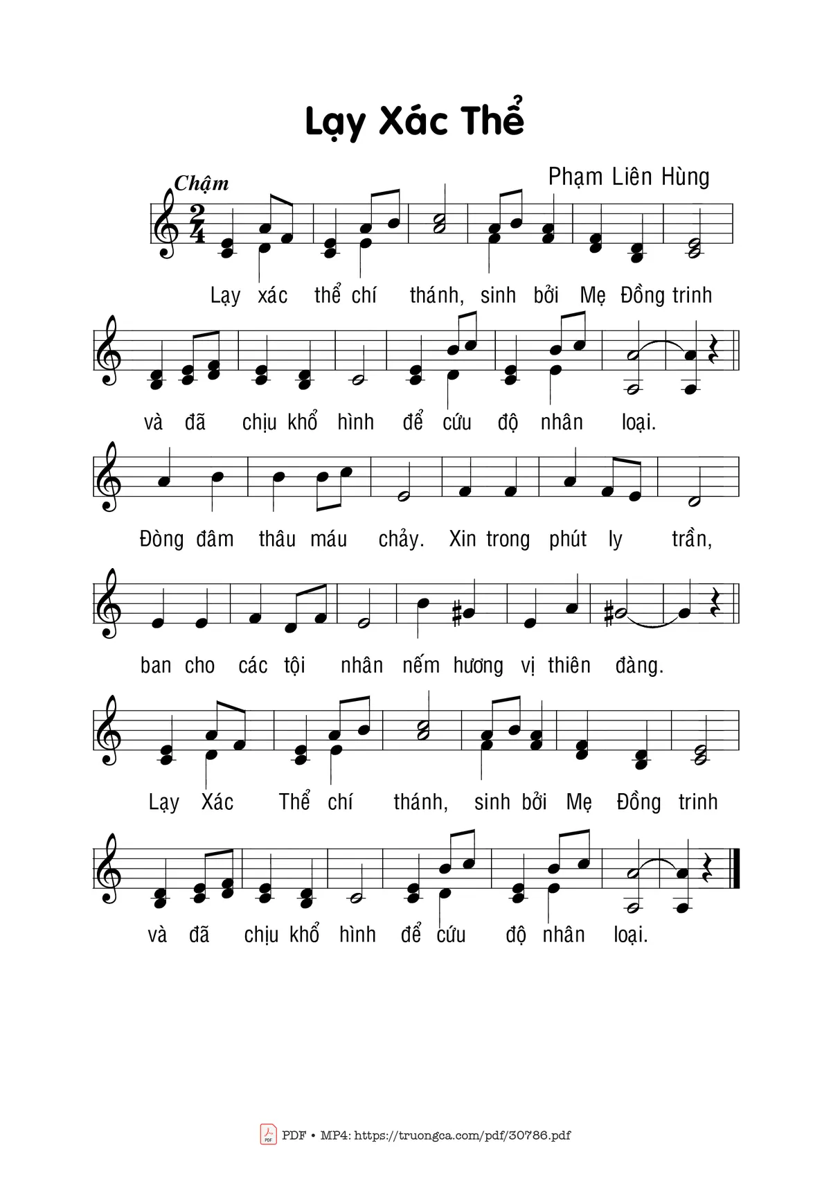Sheet nhạc có nốt Lạy xác thể của nhạc sĩ Phạm Liên Hùng và file PDF nốt nhạc đăng lên đây nhằm giúp các bạn xướng âm cho đúng nốt và hát thêm hay, chỉ mang tính chất tham khảo, không có mục đích thương mại. Bản quyền thuộc về tác giả và tổ chức nắm bản quyền, Truongca.com không giữ bất kỳ bản quyền của nội dung nào cả. Các bạn có thể tải về bản PDF chất lượng cao, gồm khuông nhạc có nốt với đường link file PDF bên trên.