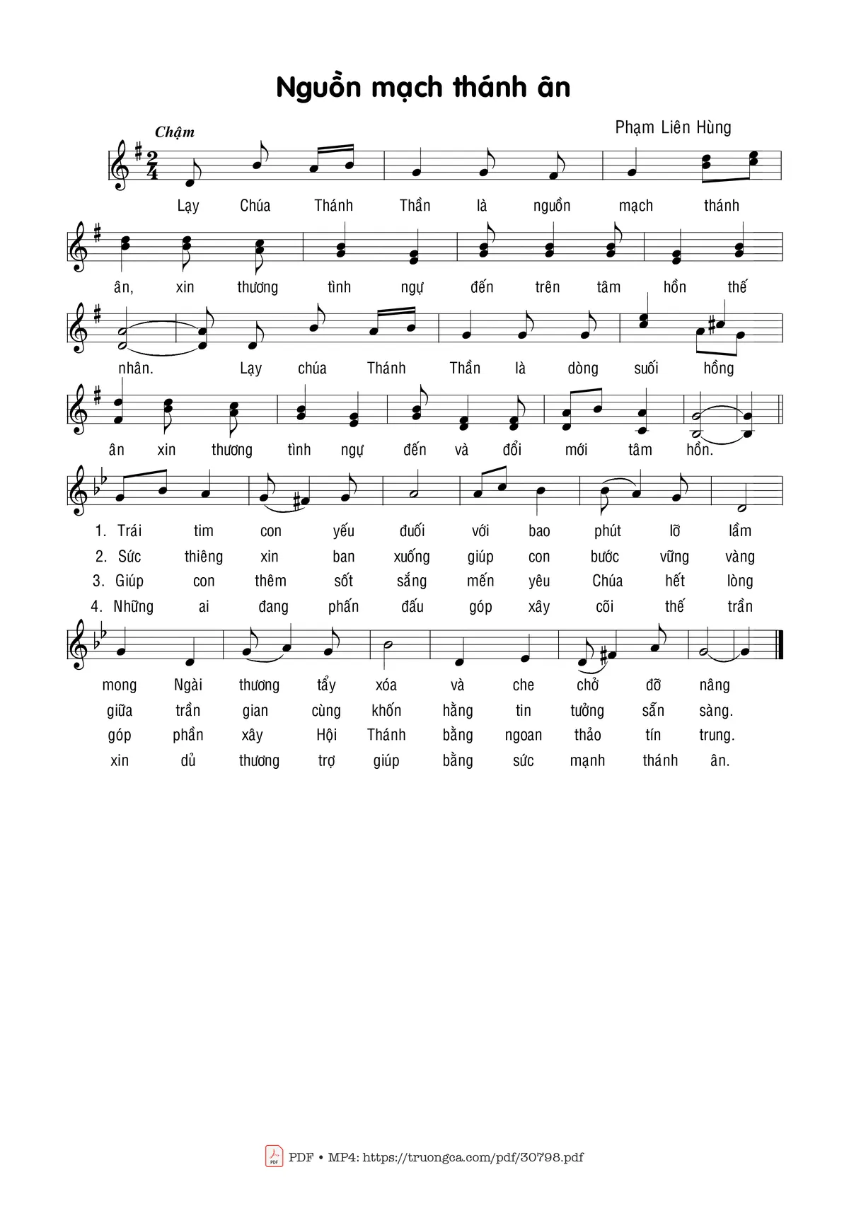 Sheet nhạc có nốt Nguồn mạch thánh ân của nhạc sĩ Phạm Liên Hùng và file PDF nốt nhạc đăng lên đây nhằm giúp các bạn xướng âm cho đúng nốt và hát thêm hay, chỉ mang tính chất tham khảo, không có mục đích thương mại. Bản quyền thuộc về tác giả và tổ chức nắm bản quyền, Truongca.com không giữ bất kỳ bản quyền của nội dung nào cả. Các bạn có thể tải về bản PDF chất lượng cao, gồm khuông nhạc có nốt với đường link file PDF bên trên.