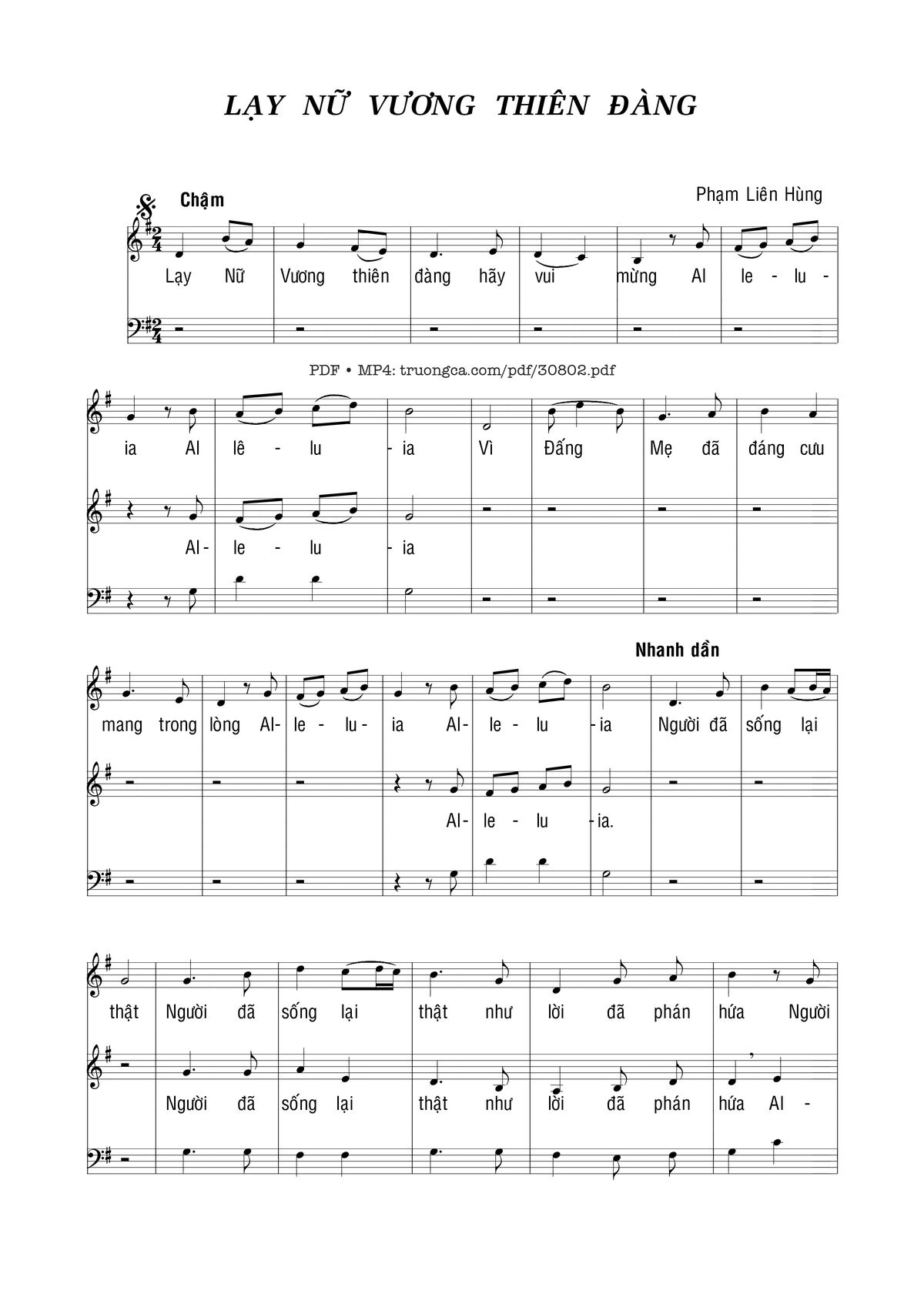 Sheet nhạc có nốt Lạy Nữ Vương Thiên Đàng của nhạc sĩ Phạm Liên Hùng và file PDF nốt nhạc đăng lên đây nhằm giúp các bạn xướng âm cho đúng nốt và hát thêm hay, chỉ mang tính chất tham khảo, không có mục đích thương mại. Bản quyền thuộc về tác giả và tổ chức nắm bản quyền, Truongca.com không giữ bất kỳ bản quyền của nội dung nào cả. Các bạn có thể tải về bản PDF chất lượng cao, gồm khuông nhạc có nốt với đường link file PDF bên trên.