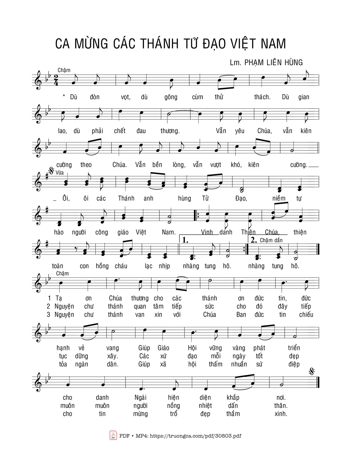 Sheet nhạc có nốt Ca mừng các Thánh Tử đạo VN của nhạc sĩ Phạm Liên Hùng và file PDF nốt nhạc đăng lên đây nhằm giúp các bạn xướng âm cho đúng nốt và hát thêm hay, chỉ mang tính chất tham khảo, không có mục đích thương mại. Bản quyền thuộc về tác giả và tổ chức nắm bản quyền, Truongca.com không giữ bất kỳ bản quyền của nội dung nào cả. Các bạn có thể tải về bản PDF chất lượng cao, gồm khuông nhạc có nốt với đường link file PDF bên trên.