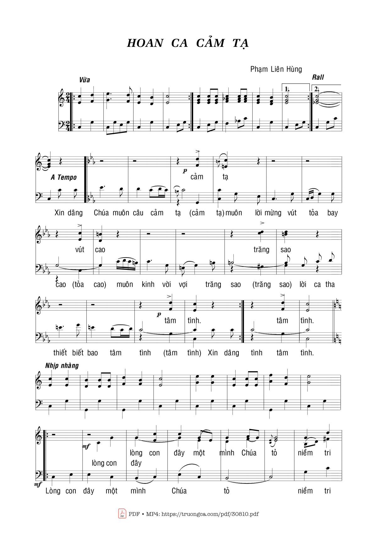 Sheet nhạc có nốt Hoan Ca Cảm Tạ của nhạc sĩ Phạm Liên Hùng và file PDF nốt nhạc đăng lên đây nhằm giúp các bạn xướng âm cho đúng nốt và hát thêm hay, chỉ mang tính chất tham khảo, không có mục đích thương mại. Bản quyền thuộc về tác giả và tổ chức nắm bản quyền, Truongca.com không giữ bất kỳ bản quyền của nội dung nào cả. Các bạn có thể tải về bản PDF chất lượng cao, gồm khuông nhạc có nốt với đường link file PDF bên trên.