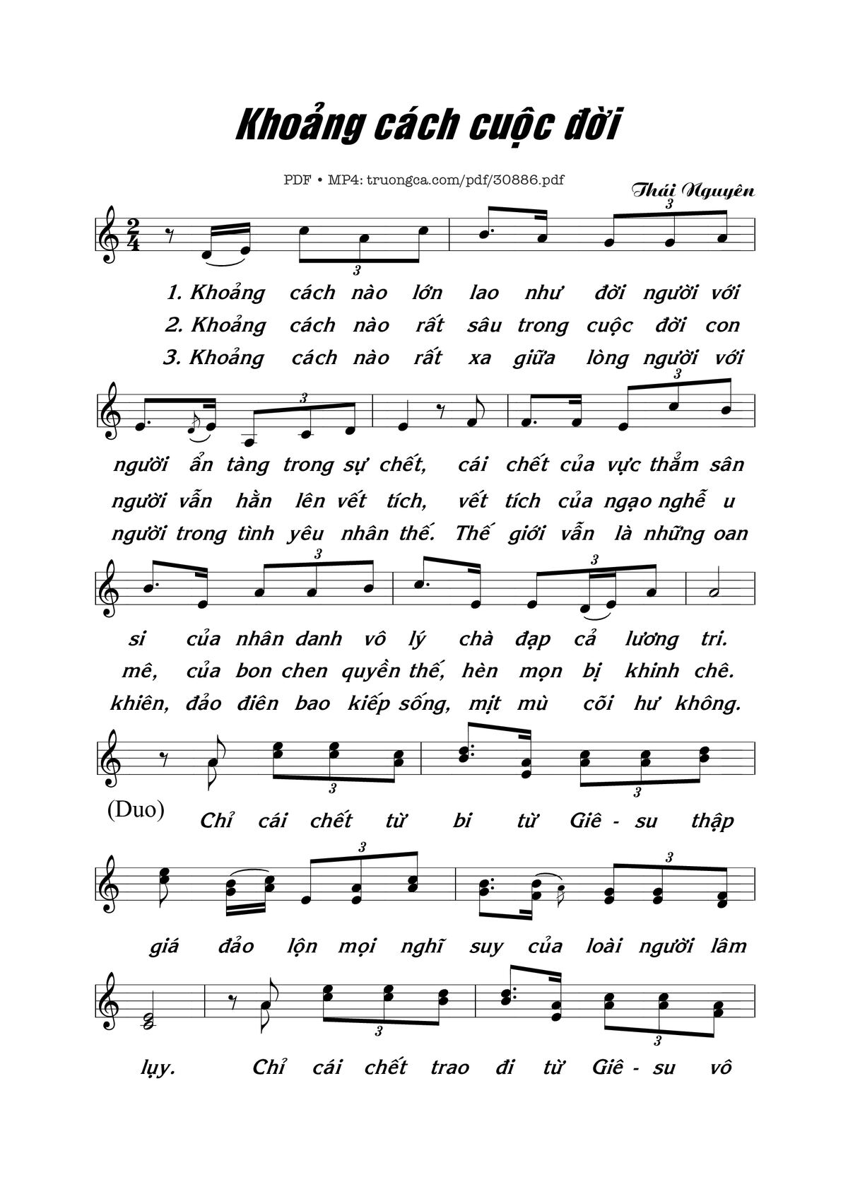 Sheet nhạc có nốt Khoảng Cách Cuộc Đời của nhạc sĩ Thái Nguyên và file PDF nốt nhạc đăng lên đây nhằm giúp các bạn xướng âm cho đúng nốt và hát thêm hay, chỉ mang tính chất tham khảo, không có mục đích thương mại. Bản quyền thuộc về tác giả và tổ chức nắm bản quyền, Truongca.com không giữ bất kỳ bản quyền của nội dung nào cả. Các bạn có thể tải về bản PDF chất lượng cao, gồm khuông nhạc có nốt với đường link file PDF bên trên.