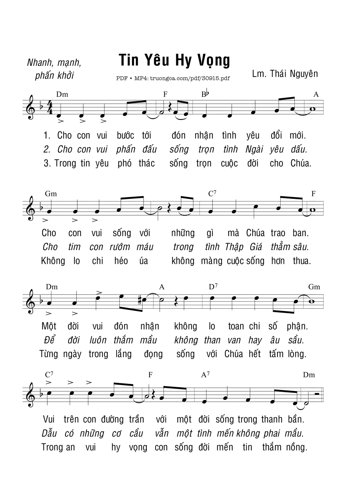 Sheet nhạc có nốt Tin yêu hy vọng của nhạc sĩ Thái Nguyên và file PDF nốt nhạc đăng lên đây nhằm giúp các bạn xướng âm cho đúng nốt và hát thêm hay, chỉ mang tính chất tham khảo, không có mục đích thương mại. Bản quyền thuộc về tác giả và tổ chức nắm bản quyền, Truongca.com không giữ bất kỳ bản quyền của nội dung nào cả. Các bạn có thể tải về bản PDF chất lượng cao, gồm khuông nhạc có nốt với đường link file PDF bên trên.