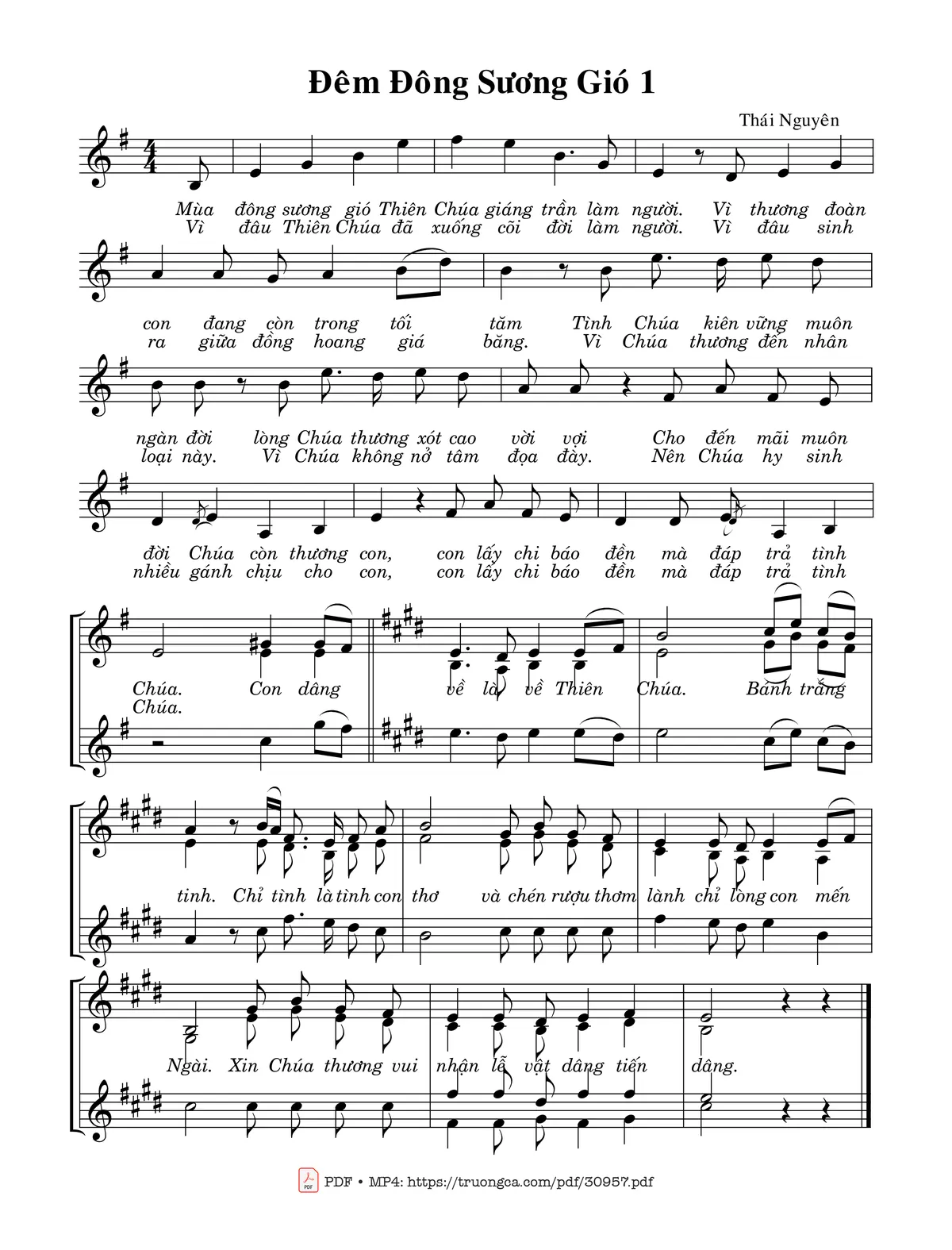 Sheet nhạc có nốt Đêm đông sương gió 1 của nhạc sĩ Thái Nguyên và file PDF nốt nhạc đăng lên đây nhằm giúp các bạn xướng âm cho đúng nốt và hát thêm hay, chỉ mang tính chất tham khảo, không có mục đích thương mại. Bản quyền thuộc về tác giả và tổ chức nắm bản quyền, Truongca.com không giữ bất kỳ bản quyền của nội dung nào cả. Các bạn có thể tải về bản PDF chất lượng cao, gồm khuông nhạc có nốt với đường link file PDF bên trên.