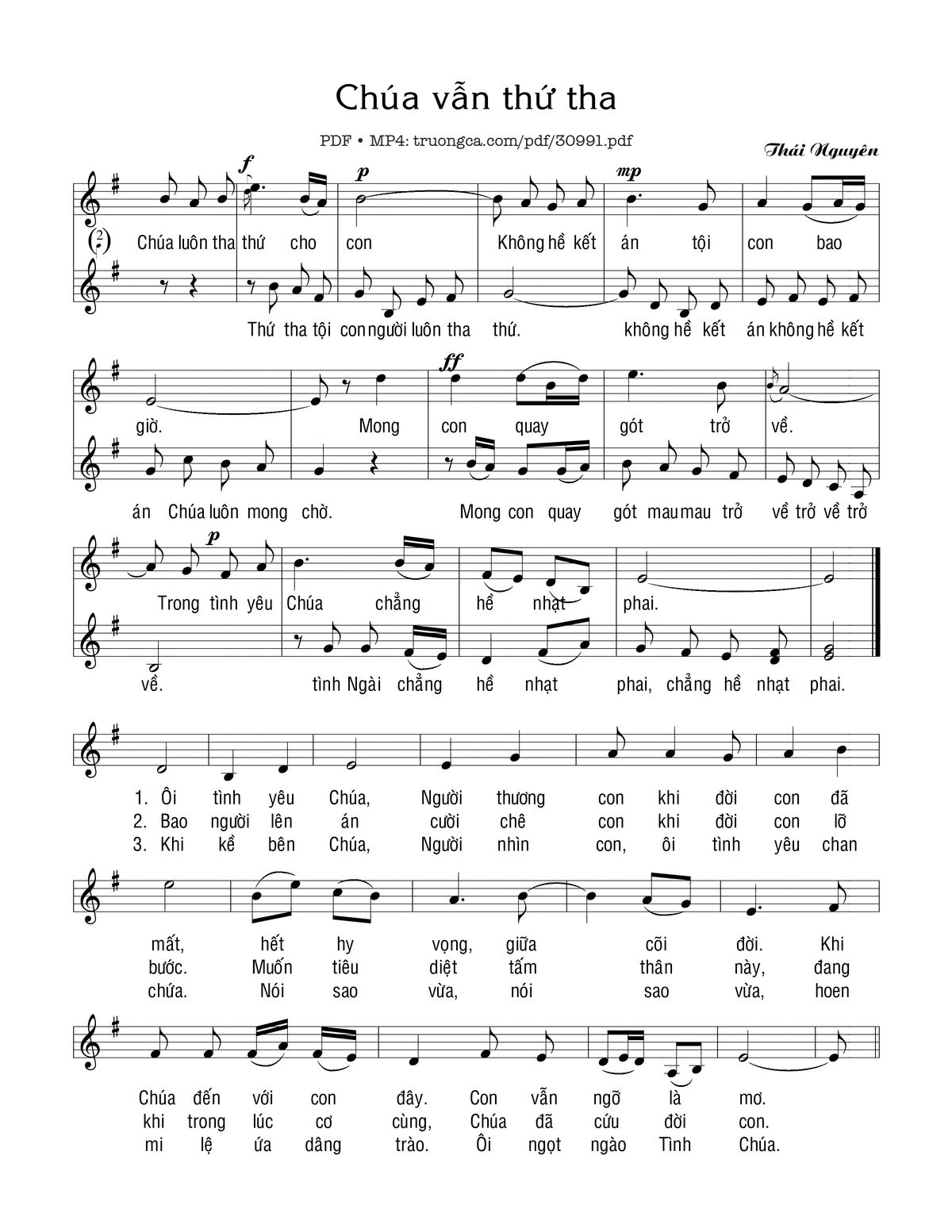 Sheet nhạc có nốt Chúa Vẫn Thứ Tha của nhạc sĩ Thái Nguyên và file PDF nốt nhạc đăng lên đây nhằm giúp các bạn xướng âm cho đúng nốt và hát thêm hay, chỉ mang tính chất tham khảo, không có mục đích thương mại. Bản quyền thuộc về tác giả và tổ chức nắm bản quyền, Truongca.com không giữ bất kỳ bản quyền của nội dung nào cả. Các bạn có thể tải về bản PDF chất lượng cao, gồm khuông nhạc có nốt với đường link file PDF bên trên.