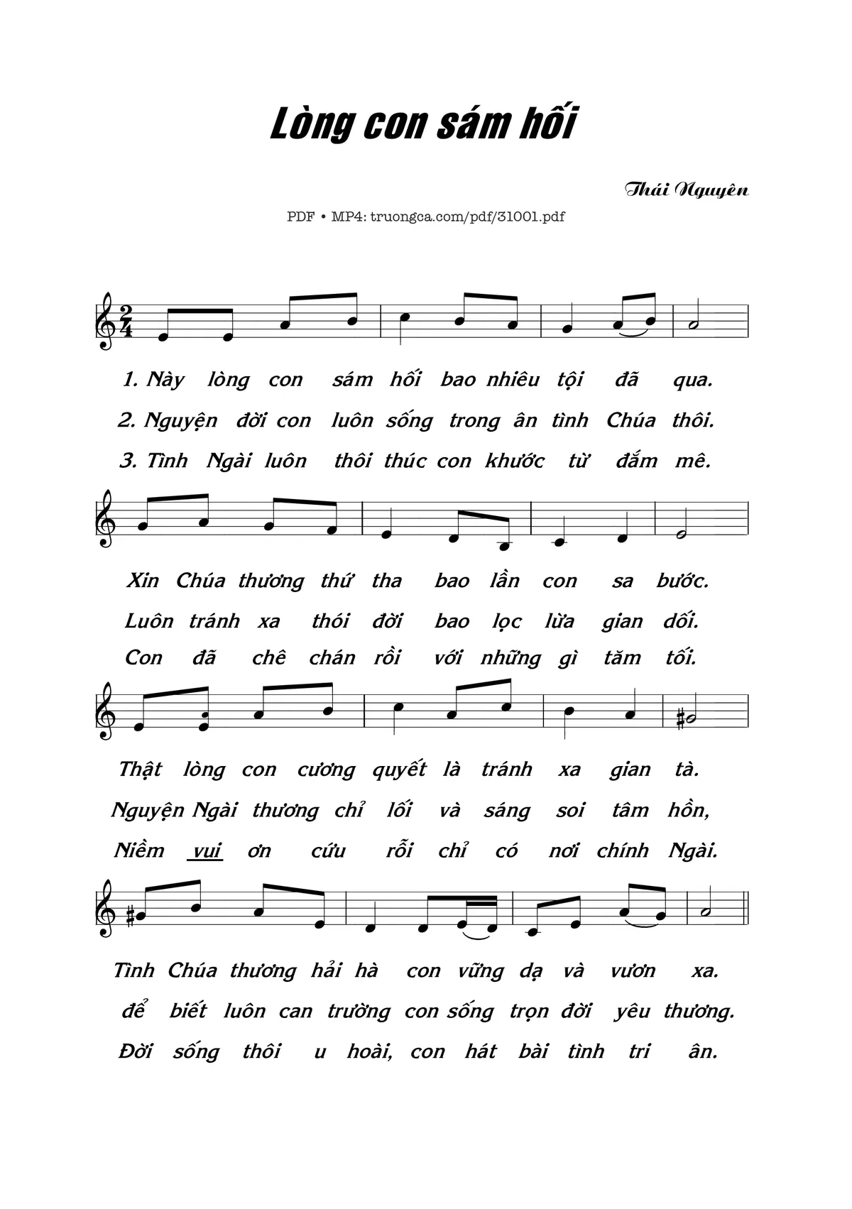 Sheet nhạc có nốt Lòng Con Sám Hối của nhạc sĩ Thái Nguyên và file PDF nốt nhạc đăng lên đây nhằm giúp các bạn xướng âm cho đúng nốt và hát thêm hay, chỉ mang tính chất tham khảo, không có mục đích thương mại. Bản quyền thuộc về tác giả và tổ chức nắm bản quyền, Truongca.com không giữ bất kỳ bản quyền của nội dung nào cả. Các bạn có thể tải về bản PDF chất lượng cao, gồm khuông nhạc có nốt với đường link file PDF bên trên.