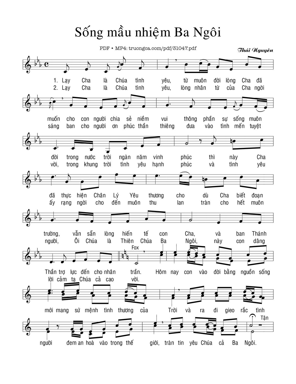 Sheet nhạc có nốt Sống mầu nhiệm Ba Ngôi của nhạc sĩ Thái Nguyên và file PDF nốt nhạc đăng lên đây nhằm giúp các bạn xướng âm cho đúng nốt và hát thêm hay, chỉ mang tính chất tham khảo, không có mục đích thương mại. Bản quyền thuộc về tác giả và tổ chức nắm bản quyền, Truongca.com không giữ bất kỳ bản quyền của nội dung nào cả. Các bạn có thể tải về bản PDF chất lượng cao, gồm khuông nhạc có nốt với đường link file PDF bên trên.