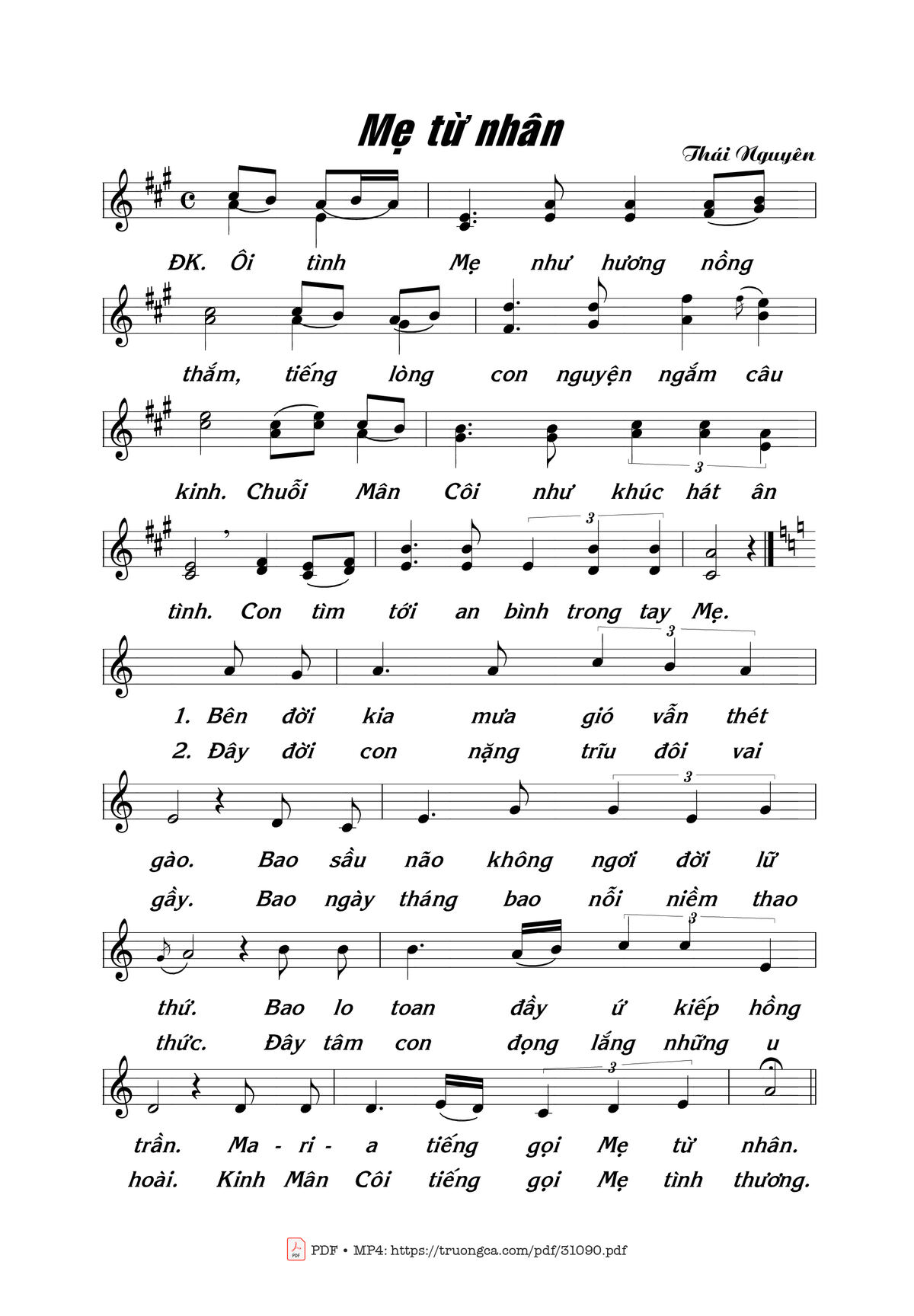 Sheet nhạc có nốt Mẹ Từ Nhân của nhạc sĩ Thái Nguyên và file PDF nốt nhạc đăng lên đây nhằm giúp các bạn xướng âm cho đúng nốt và hát thêm hay, chỉ mang tính chất tham khảo, không có mục đích thương mại. Bản quyền thuộc về tác giả và tổ chức nắm bản quyền, Truongca.com không giữ bất kỳ bản quyền của nội dung nào cả. Các bạn có thể tải về bản PDF chất lượng cao, gồm khuông nhạc có nốt với đường link file PDF bên trên.