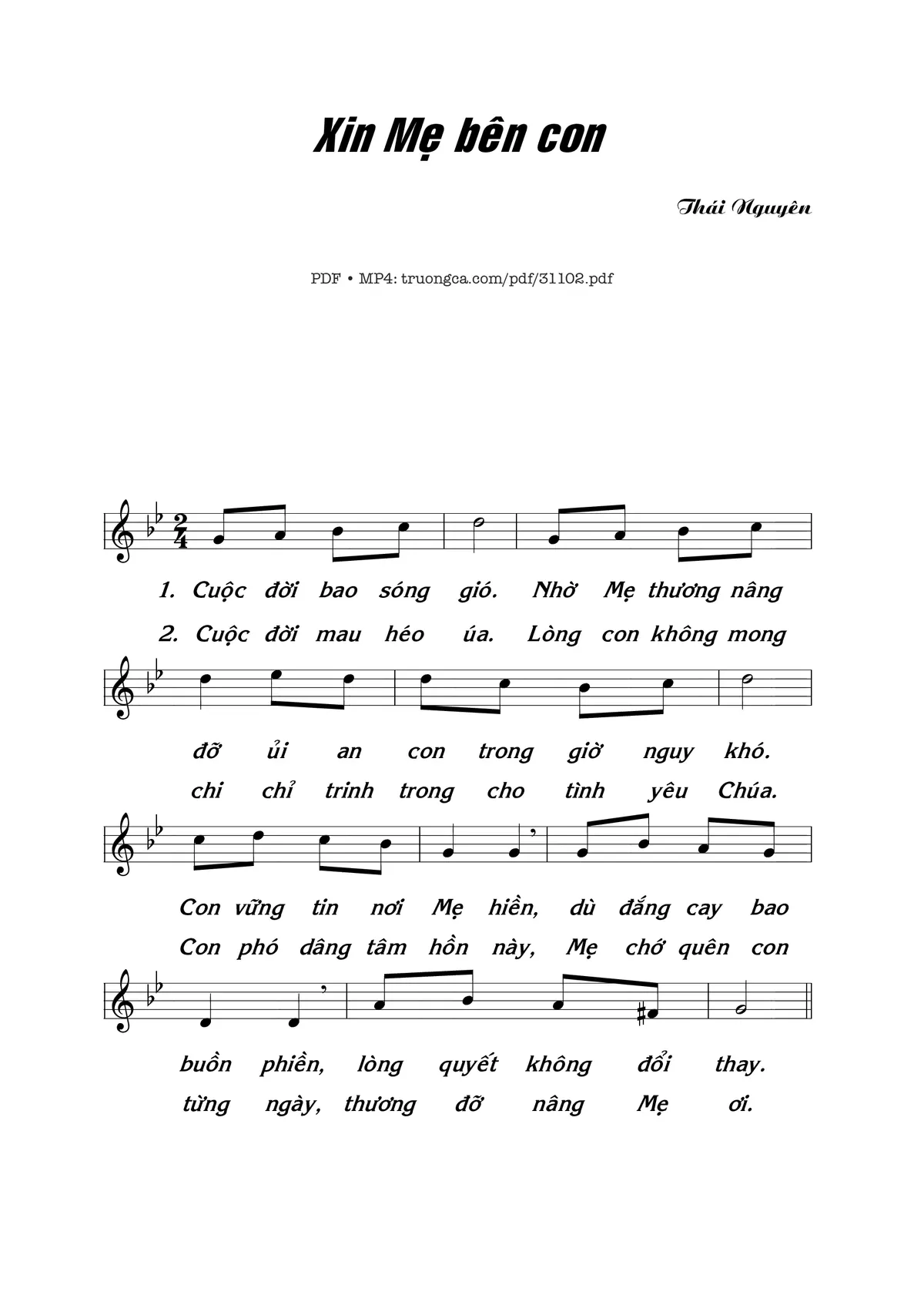 Sheet nhạc có nốt Xin Mẹ bên con của nhạc sĩ Thái Nguyên và file PDF nốt nhạc đăng lên đây nhằm giúp các bạn xướng âm cho đúng nốt và hát thêm hay, chỉ mang tính chất tham khảo, không có mục đích thương mại. Bản quyền thuộc về tác giả và tổ chức nắm bản quyền, Truongca.com không giữ bất kỳ bản quyền của nội dung nào cả. Các bạn có thể tải về bản PDF chất lượng cao, gồm khuông nhạc có nốt với đường link file PDF bên trên.