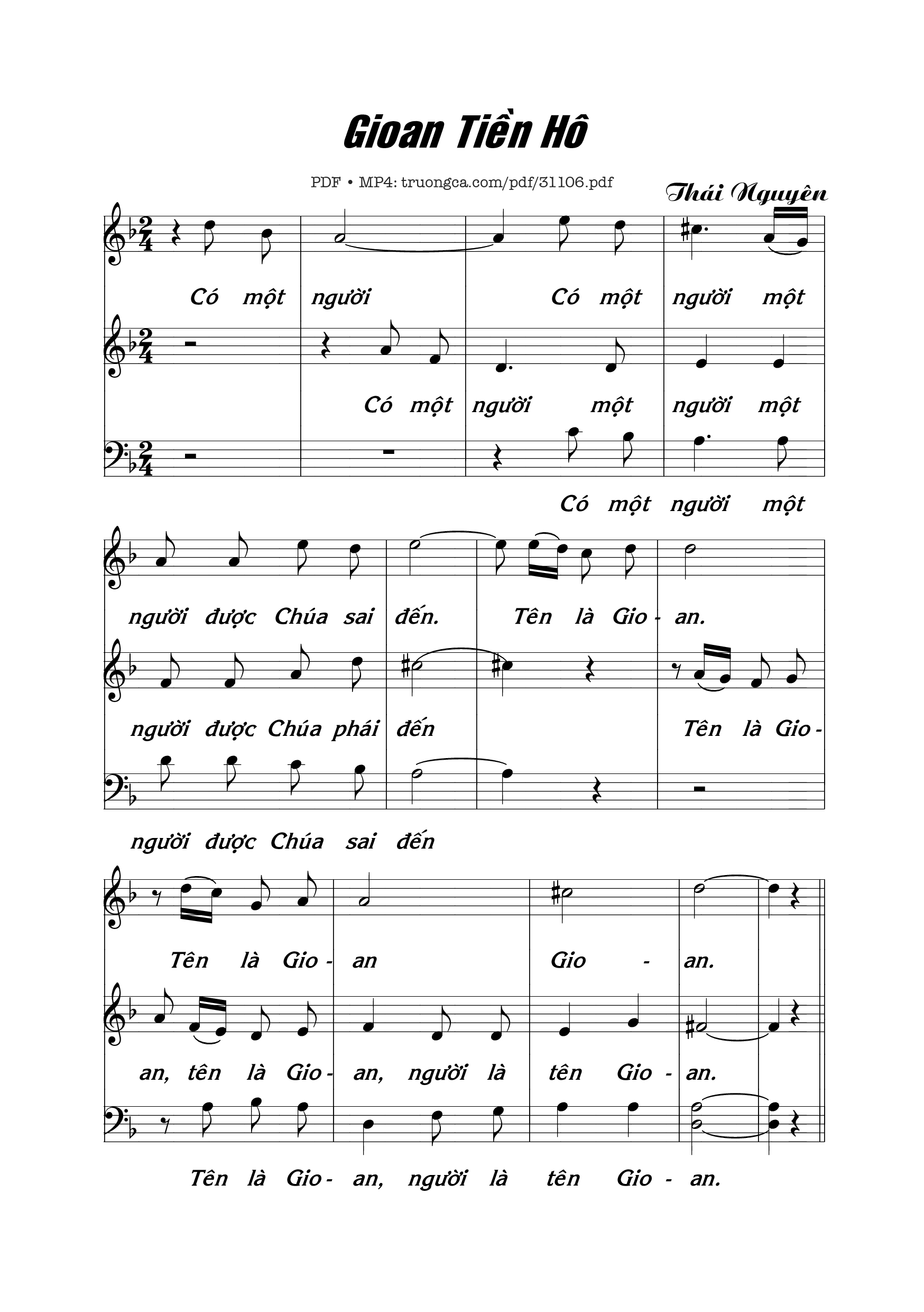 Sheet nhạc có nốt Gioan Tiền Hô của nhạc sĩ Thái Nguyên và file PDF nốt nhạc đăng lên đây nhằm giúp các bạn xướng âm cho đúng nốt và hát thêm hay, chỉ mang tính chất tham khảo, không có mục đích thương mại. Bản quyền thuộc về tác giả và tổ chức nắm bản quyền, Truongca.com không giữ bất kỳ bản quyền của nội dung nào cả. Các bạn có thể tải về bản PDF chất lượng cao, gồm khuông nhạc có nốt với đường link file PDF bên trên.