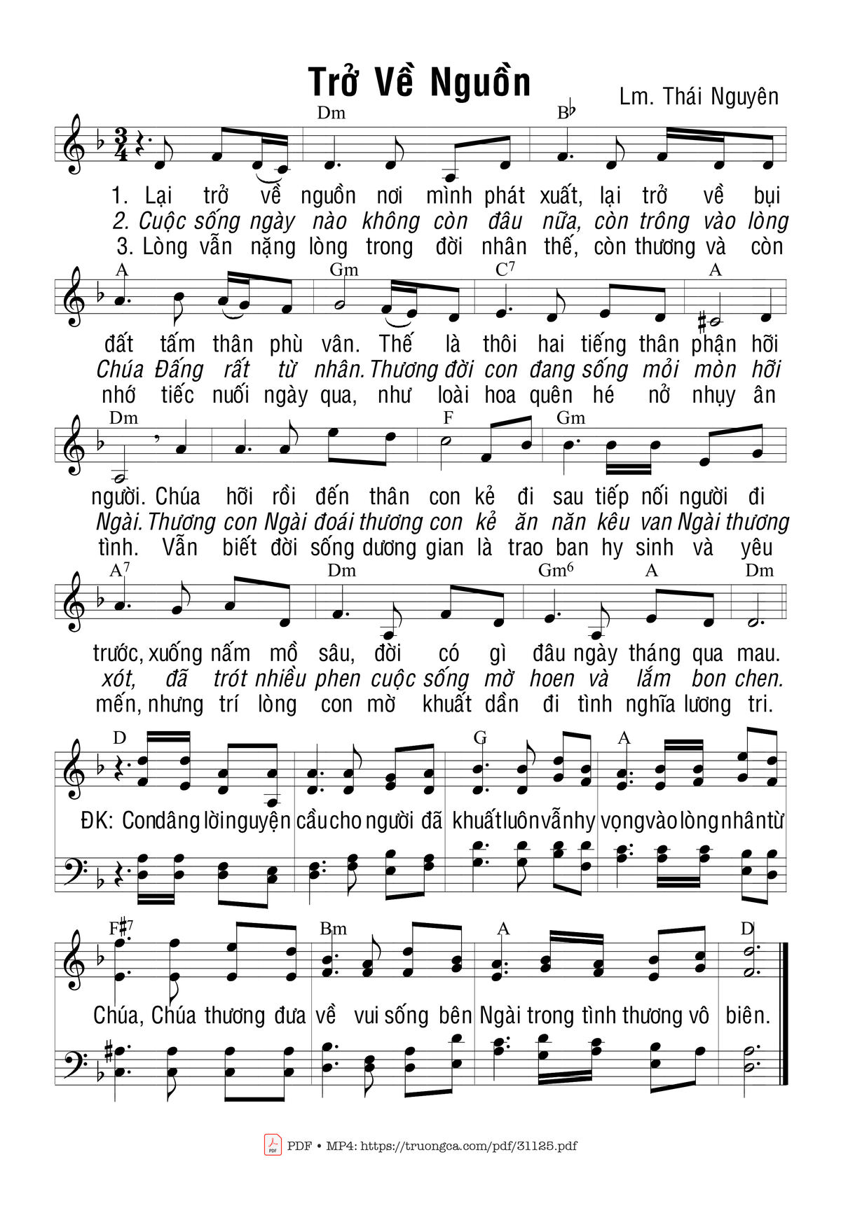 Sheet nhạc có nốt Trở về nguồn của nhạc sĩ Thái Nguyên và file PDF nốt nhạc đăng lên đây nhằm giúp các bạn xướng âm cho đúng nốt và hát thêm hay, chỉ mang tính chất tham khảo, không có mục đích thương mại. Bản quyền thuộc về tác giả và tổ chức nắm bản quyền, Truongca.com không giữ bất kỳ bản quyền của nội dung nào cả. Các bạn có thể tải về bản PDF chất lượng cao, gồm khuông nhạc có nốt với đường link file PDF bên trên.