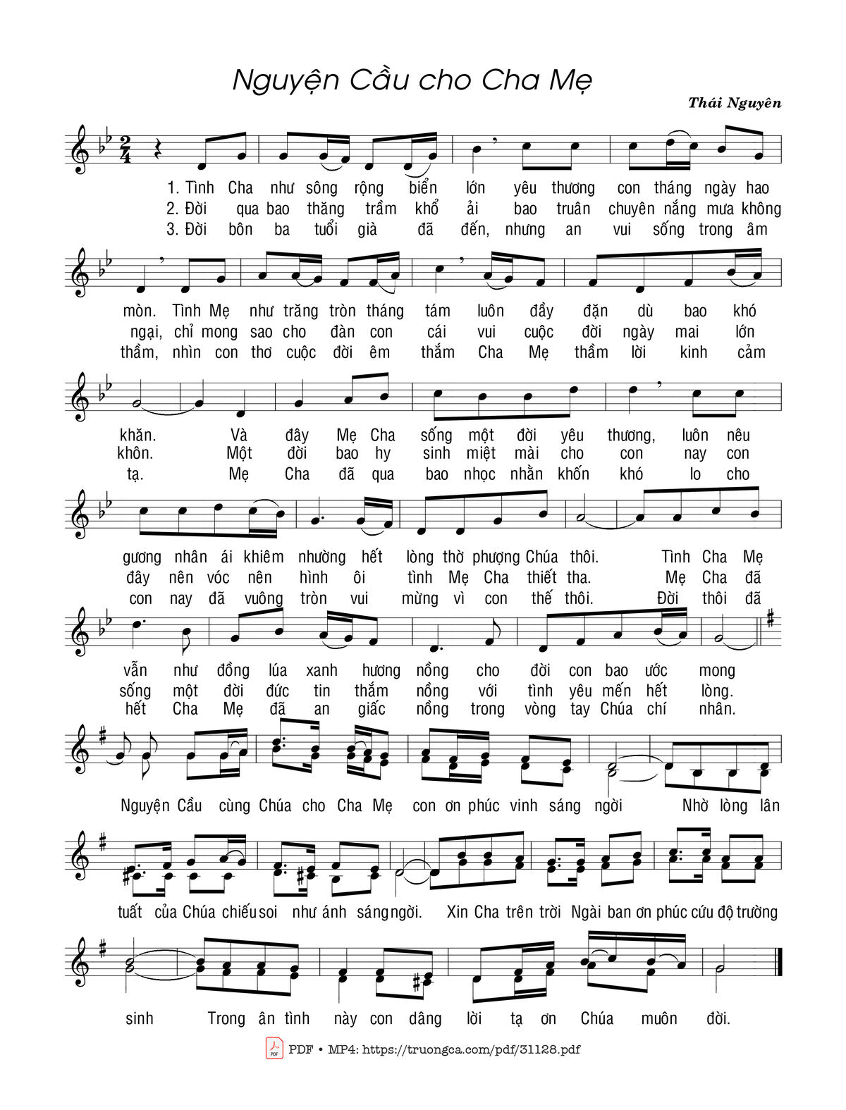 Sheet nhạc có nốt Nguyện Cầu Cho Cha Mẹ của nhạc sĩ Thái Nguyên và file PDF nốt nhạc đăng lên đây nhằm giúp các bạn xướng âm cho đúng nốt và hát thêm hay, chỉ mang tính chất tham khảo, không có mục đích thương mại. Bản quyền thuộc về tác giả và tổ chức nắm bản quyền, Truongca.com không giữ bất kỳ bản quyền của nội dung nào cả. Các bạn có thể tải về bản PDF chất lượng cao, gồm khuông nhạc có nốt với đường link file PDF bên trên.