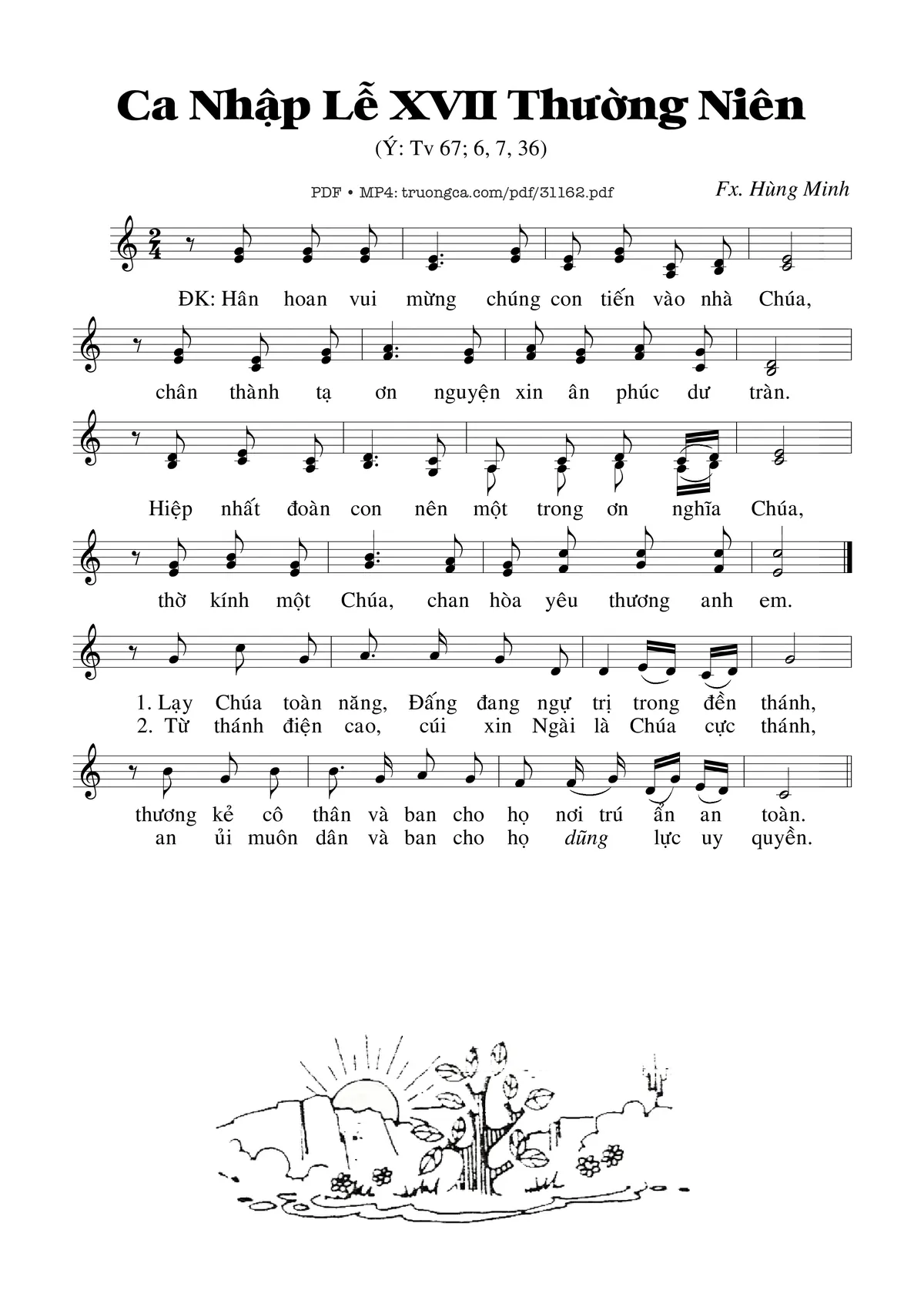 Điệp khúc. Hân hoan vui mừng chúng con tiến vào nhà Chúa, chân thành tạ ơn nguyện xin ân phúc dư tràn. Hiệp nhất đoàn con nên một trong ơn nghĩa Chúa, thờ kính một Chúa, chan hòa yêu thương anh em.