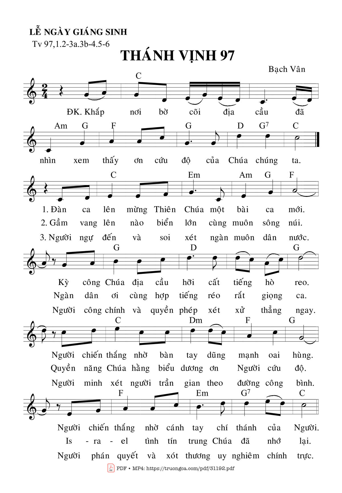 Sheet nhạc có nốt Thánh Vịnh 97, Lễ Ban Ngày Giáng Sinh của nhạc sĩ Bạch Vân và file PDF nốt nhạc đăng lên đây nhằm giúp các bạn xướng âm cho đúng nốt và hát thêm hay, chỉ mang tính chất tham khảo, không có mục đích thương mại. Bản quyền thuộc về tác giả và tổ chức nắm bản quyền, Truongca.com không giữ bất kỳ bản quyền của nội dung nào cả. Các bạn có thể tải về bản PDF chất lượng cao, gồm khuông nhạc có nốt với đường link file PDF bên trên.