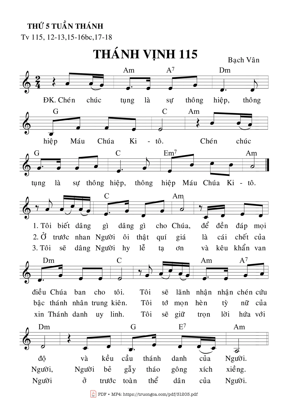 Sheet nhạc có nốt Thánh Vịnh 115, Thứ Năm Tuần Thánh của nhạc sĩ Bạch Vân và file PDF nốt nhạc đăng lên đây nhằm giúp các bạn xướng âm cho đúng nốt và hát thêm hay, chỉ mang tính chất tham khảo, không có mục đích thương mại. Bản quyền thuộc về tác giả và tổ chức nắm bản quyền, Truongca.com không giữ bất kỳ bản quyền của nội dung nào cả. Các bạn có thể tải về bản PDF chất lượng cao, gồm khuông nhạc có nốt với đường link file PDF bên trên.