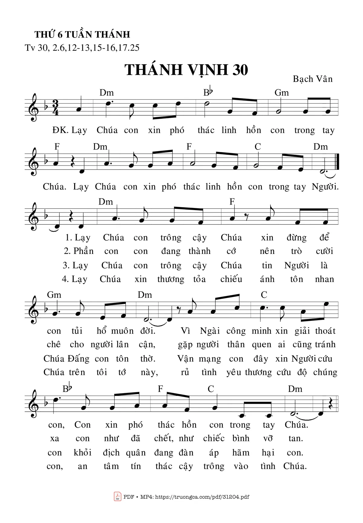 Sheet nhạc có nốt Thánh Vịnh 30, Thứ Sáu Tuần Thánh của nhạc sĩ Bạch Vân và file PDF nốt nhạc đăng lên đây nhằm giúp các bạn xướng âm cho đúng nốt và hát thêm hay, chỉ mang tính chất tham khảo, không có mục đích thương mại. Bản quyền thuộc về tác giả và tổ chức nắm bản quyền, Truongca.com không giữ bất kỳ bản quyền của nội dung nào cả. Các bạn có thể tải về bản PDF chất lượng cao, gồm khuông nhạc có nốt với đường link file PDF bên trên.