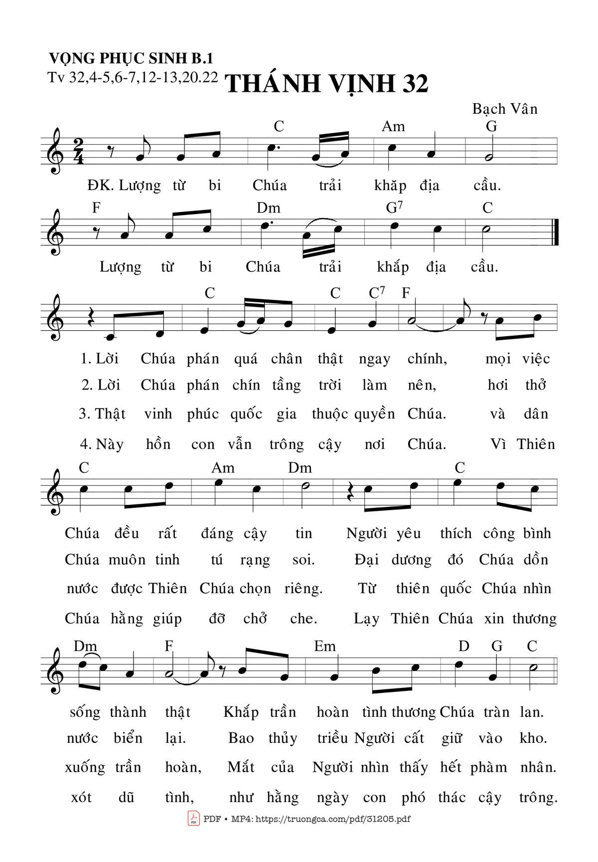 Sheet nhạc có nốt Thánh Vịnh 32, Vọng Phục Sinh – Bài 1 của nhạc sĩ Bạch Vân và file PDF nốt nhạc đăng lên đây nhằm giúp các bạn xướng âm cho đúng nốt và hát thêm hay, chỉ mang tính chất tham khảo, không có mục đích thương mại. Bản quyền thuộc về tác giả và tổ chức nắm bản quyền, Truongca.com không giữ bất kỳ bản quyền của nội dung nào cả. Các bạn có thể tải về bản PDF chất lượng cao, gồm khuông nhạc có nốt với đường link file PDF bên trên.