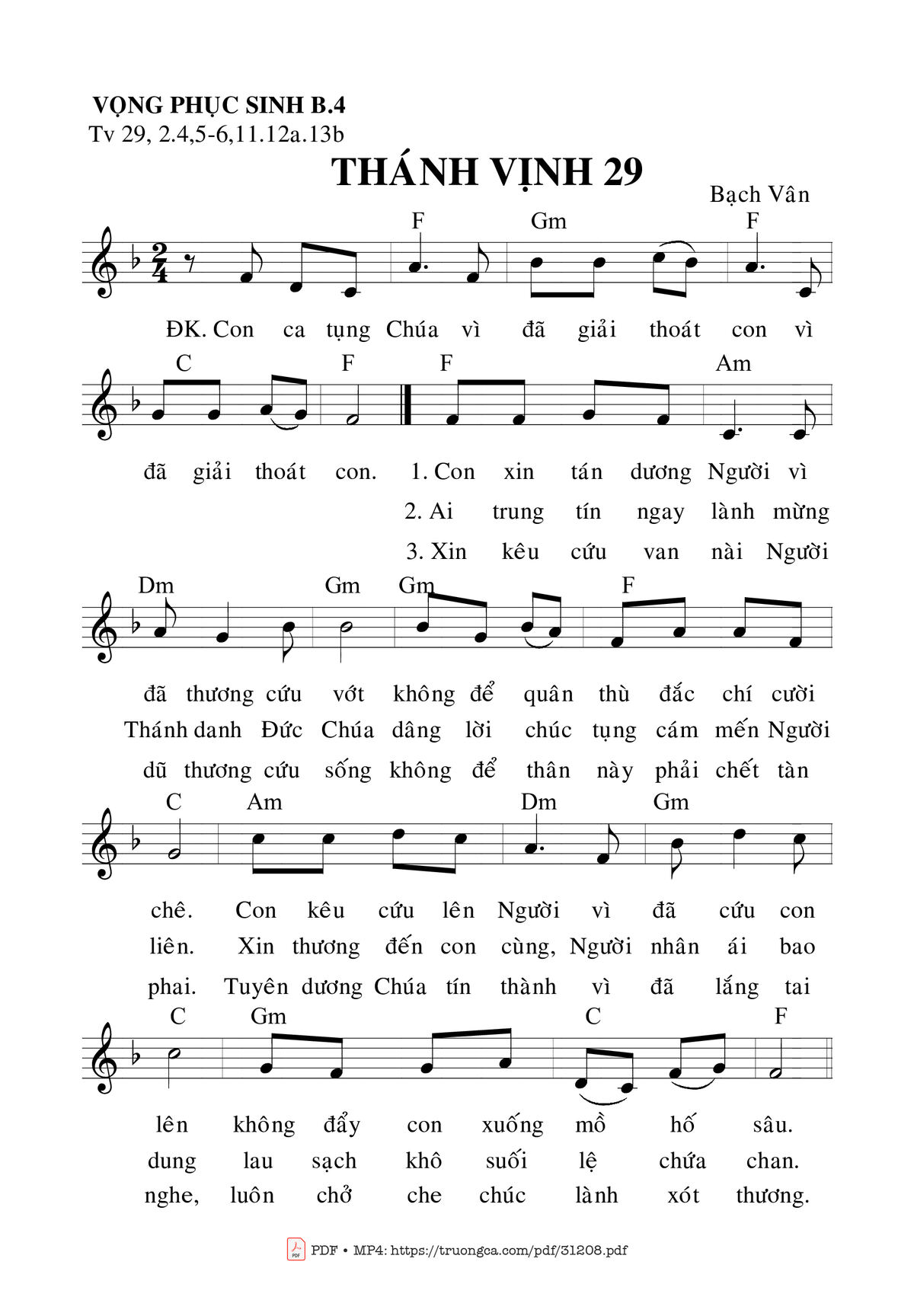 Sheet nhạc có nốt Thánh Vịnh 29, Vọng Phục Sinh – Bài 4 của nhạc sĩ Bạch Vân và file PDF nốt nhạc đăng lên đây nhằm giúp các bạn xướng âm cho đúng nốt và hát thêm hay, chỉ mang tính chất tham khảo, không có mục đích thương mại. Bản quyền thuộc về tác giả và tổ chức nắm bản quyền, Truongca.com không giữ bất kỳ bản quyền của nội dung nào cả. Các bạn có thể tải về bản PDF chất lượng cao, gồm khuông nhạc có nốt với đường link file PDF bên trên.