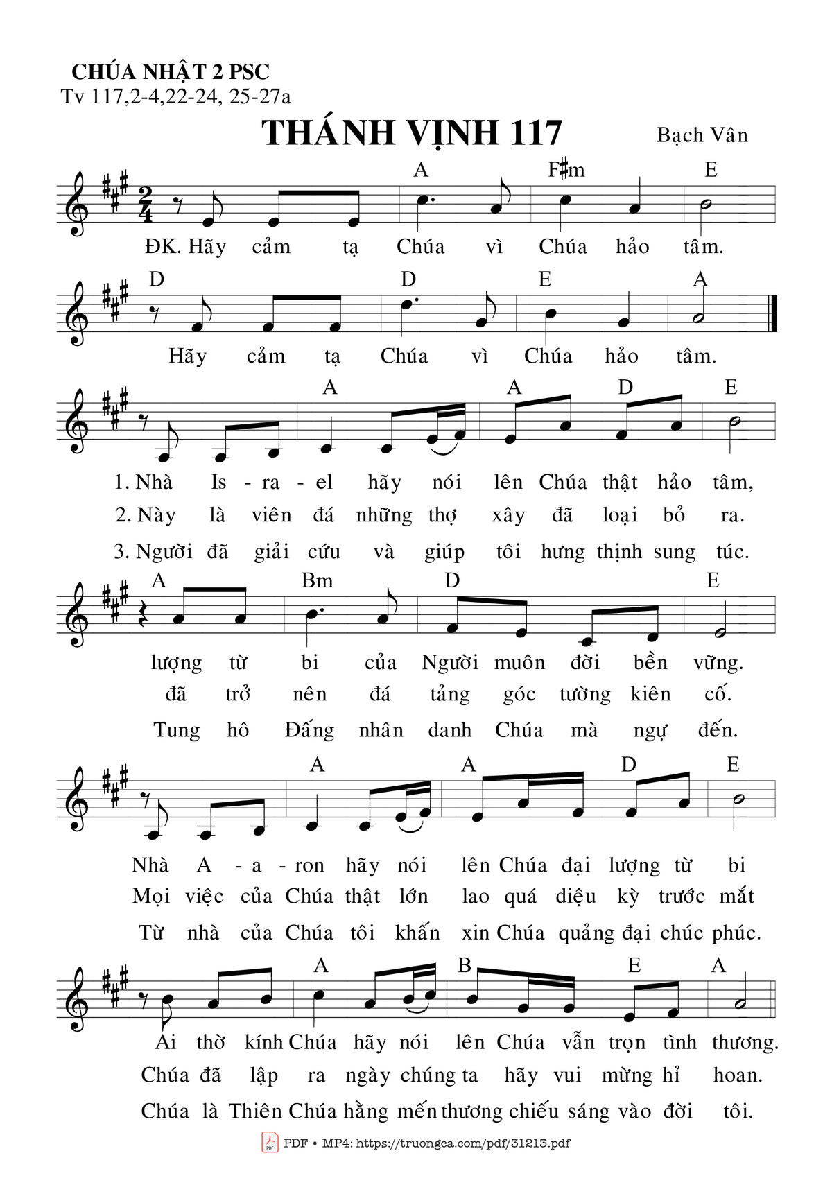 Sheet nhạc có nốt Thánh Vịnh 117, Chúa Nhật 2C Phục Sinh của nhạc sĩ Bạch Vân và file PDF nốt nhạc đăng lên đây nhằm giúp các bạn xướng âm cho đúng nốt và hát thêm hay, chỉ mang tính chất tham khảo, không có mục đích thương mại. Bản quyền thuộc về tác giả và tổ chức nắm bản quyền, Truongca.com không giữ bất kỳ bản quyền của nội dung nào cả. Các bạn có thể tải về bản PDF chất lượng cao, gồm khuông nhạc có nốt với đường link file PDF bên trên.